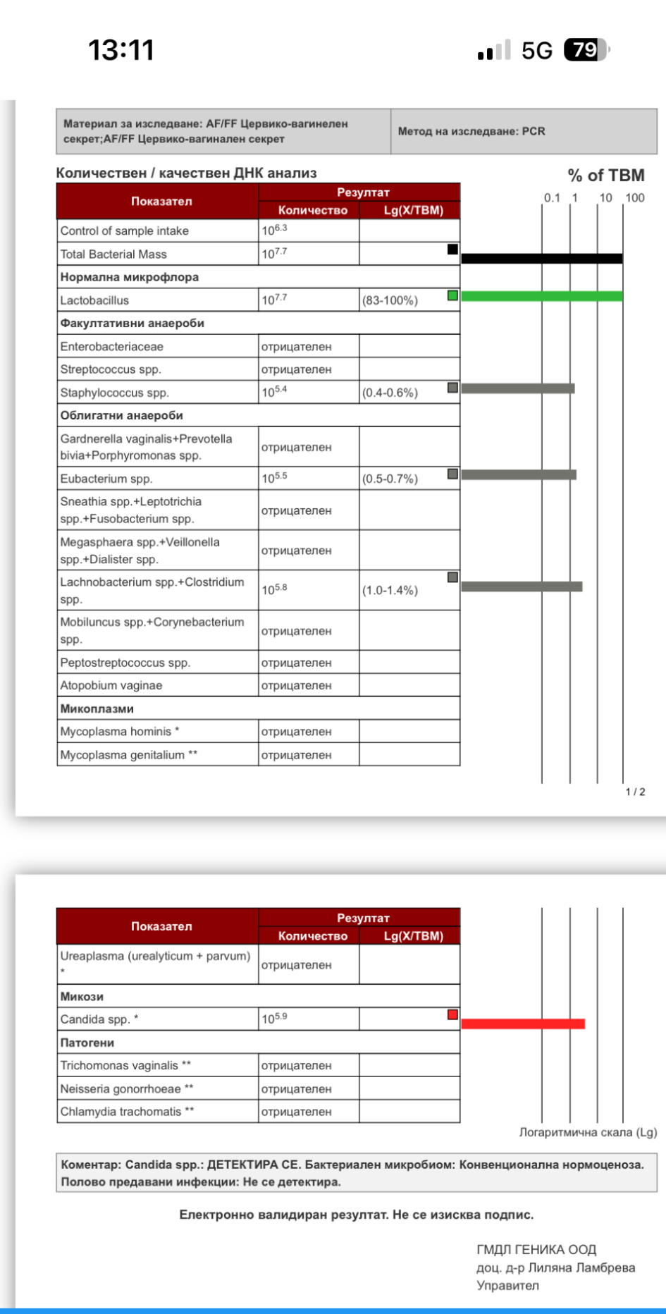 Прикачвам се резултата от Геника,кажете ми сега щом се изолира Candida, как изобщо това не се изкоментира на микробиологията.И от Лаборескспрес писаха малко лактобацили, а по това процъфтяват.Тези в сиво как са?