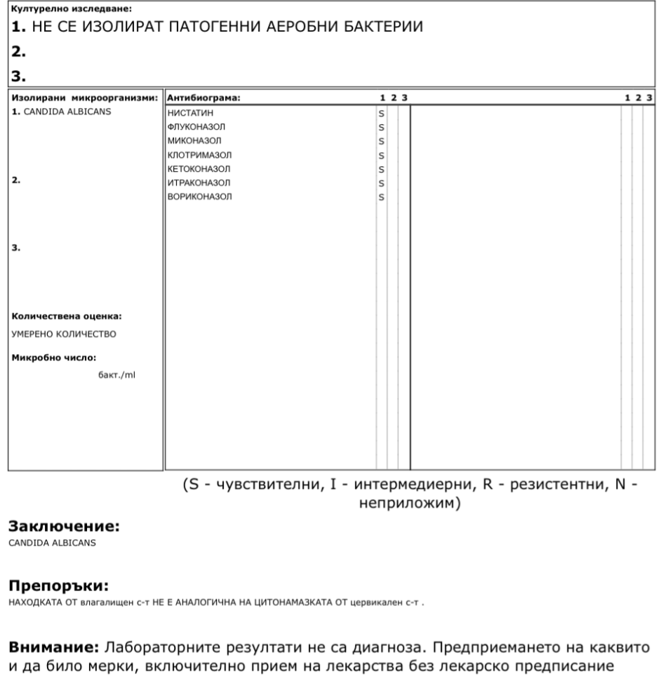 Самоцитирам се и прилагам резултата от n-тата на брой микробиология, пусната на две места ,като и на двете се детектира тривиалната Candida albicans…която не можаха да открият още на първото изследване…Утре ще пусна на АГ, но долу горе ми е ясна работата .Според вас кой препарат ще даде най-добър резултат ,както за мен,така и за партньорът?Пия Кандизин засега докато ми излезе резултатата ,това беше препоръката на АГ след Гениката.