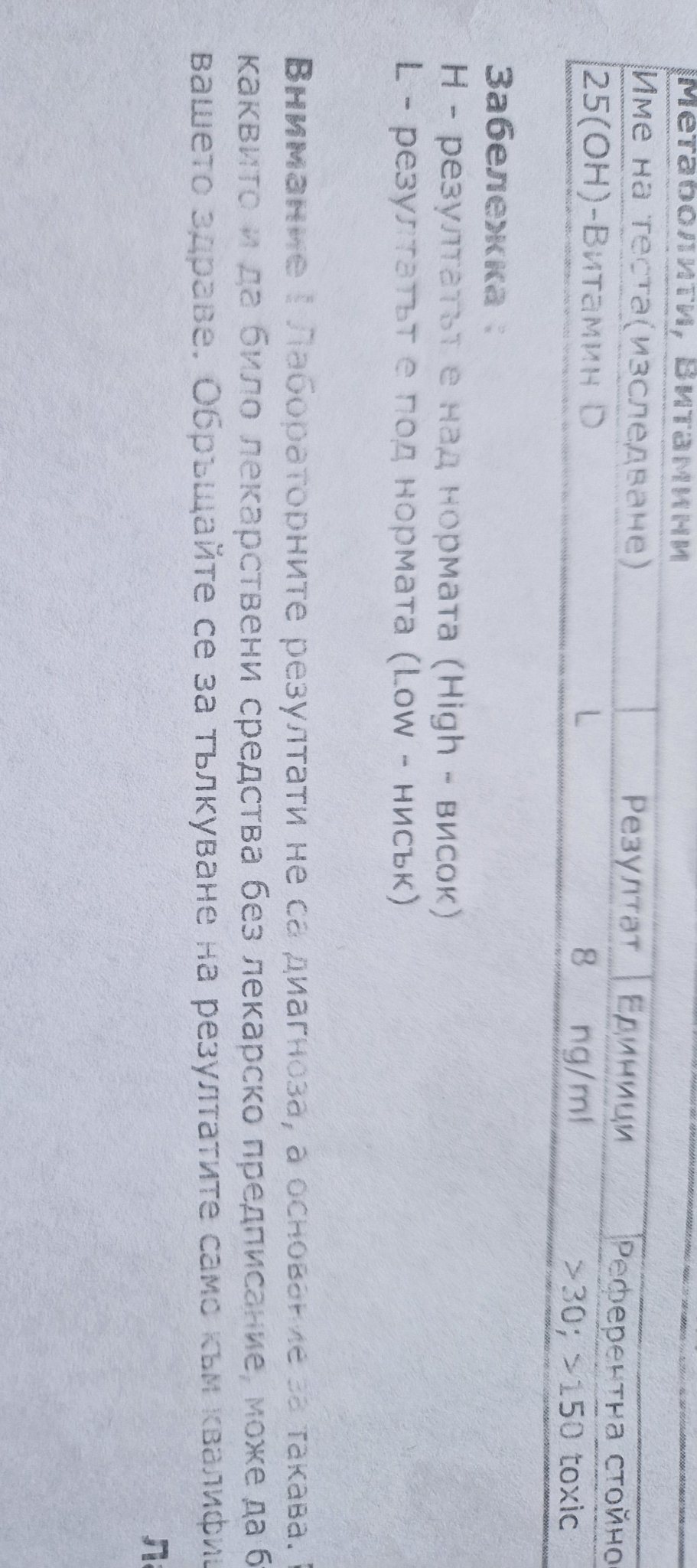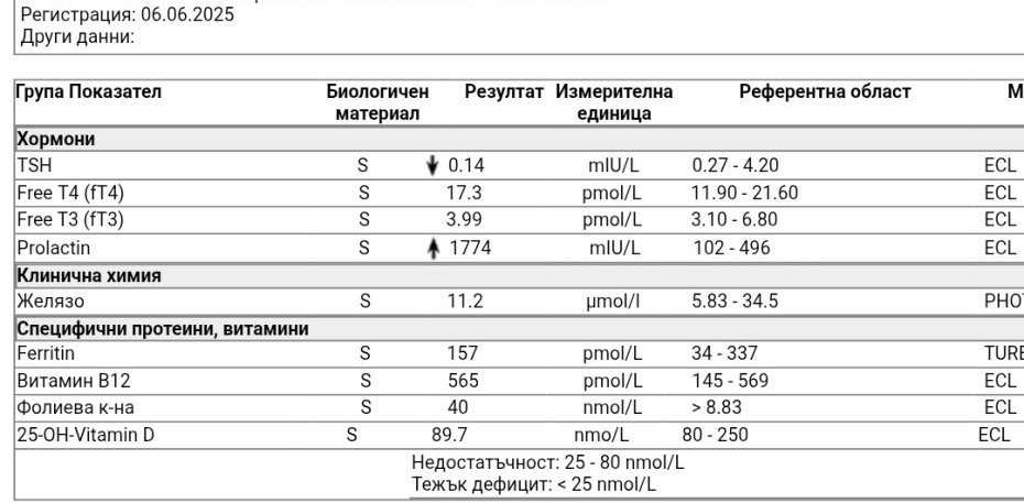 Здравейте! Включвам се аз отново с резултатите ми от днес - преди около месец си коригирах сама дозата на Еутирокс - преди бях на 25-50мкг редуване, а сега явно съм предобрила с 50-75мкг, та може би златната среда за мен биха били 50мкг? Също виждам, че витамин Д ми е гранично, намаляло е леко спрямо преди, но имам подобряване съвсем малко при желязото. За б12 се чудих дали щом е на горна граница на тези референтни е добре или да продължа да суплементирам и него?
