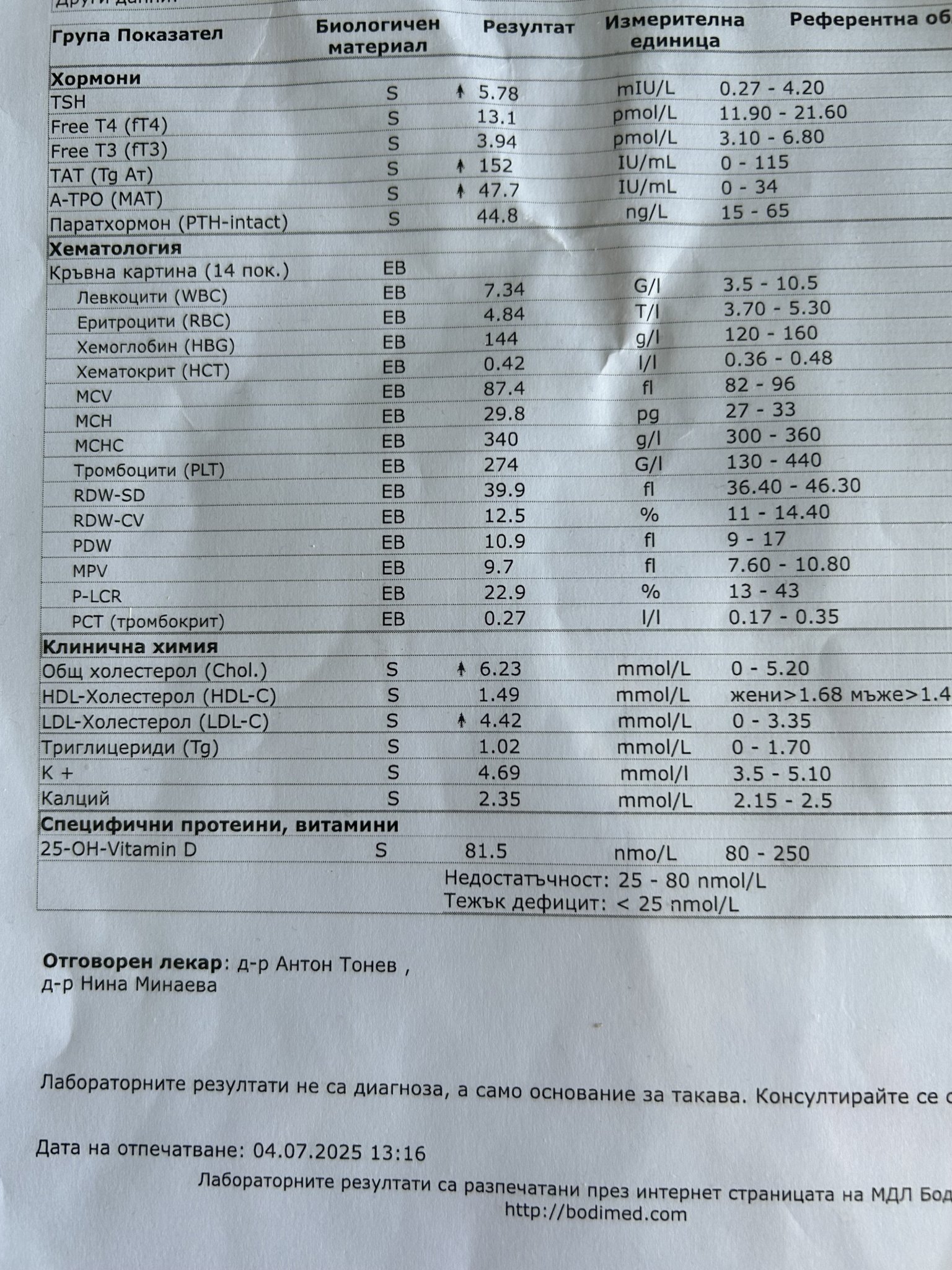 Роси, да не те отчайвам, но аз със същите резултати T4 и ТСХ над нормата получих едно - всичко е супер, няма Ви нищо от млада лекарка. Отидох при друг ендокринолог ( наборче на майка ми - т.е. към 70-те) и тя най-накря обърна внимание на хипофункцията, обясни ми защо въпреки че нямам завишени антитела съм диагностицирана с хашимото и ми изписа хормон. Към момента приемам 25 мкг (1.3мл аку тирокс) и след 6 седмици ще се видим пак за изследвания и корекция на дозата.