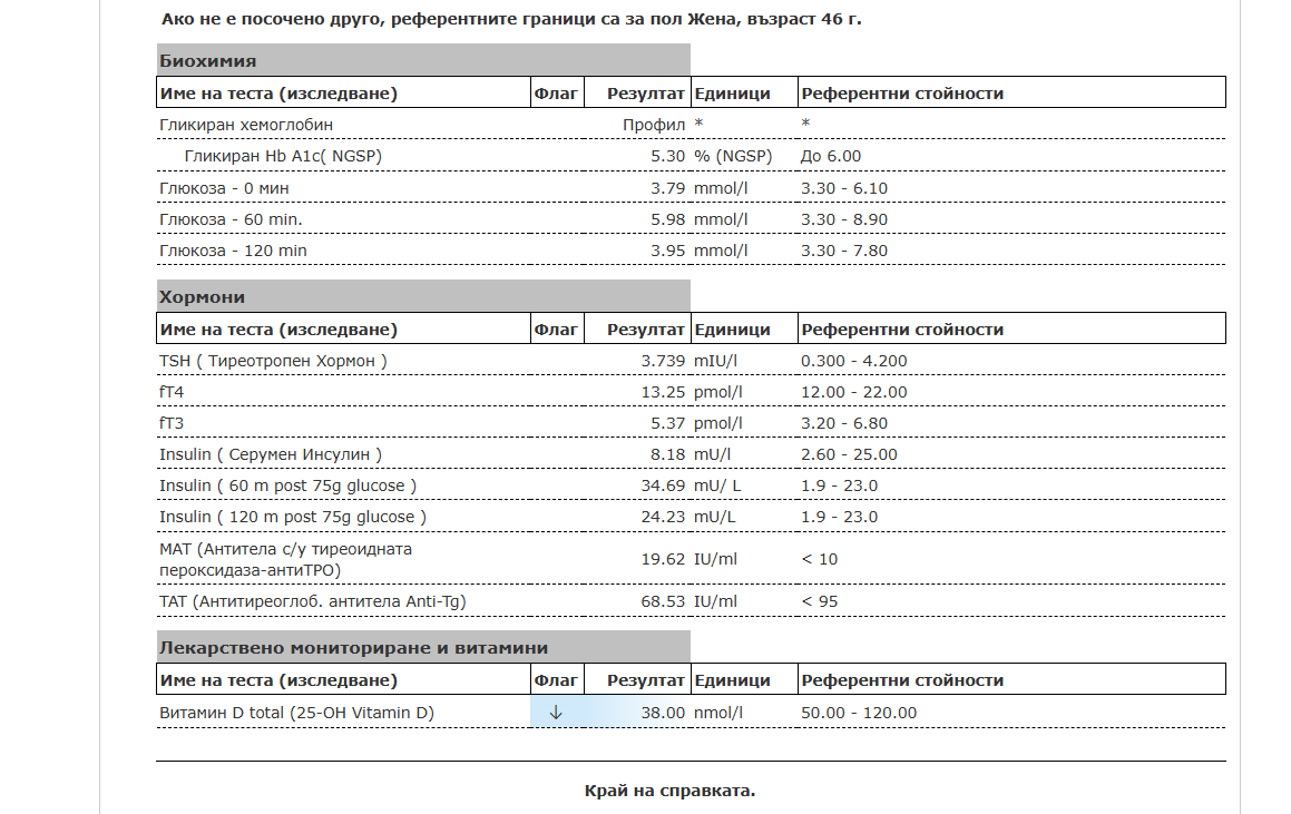 Имате хипофункция и Хашимото. Все още жлезата успява да компенсира с фт3, но това няма да е за дълго. Вече сте за хормон. Сериозен дефицит на вит Д. Ако решите, трябва да пиете поне по 5000 единици дневно, за да тръгне на някъде. Хипофункцията има връзка и с никаквото вит Д, но си има и антитела за Хашимото.