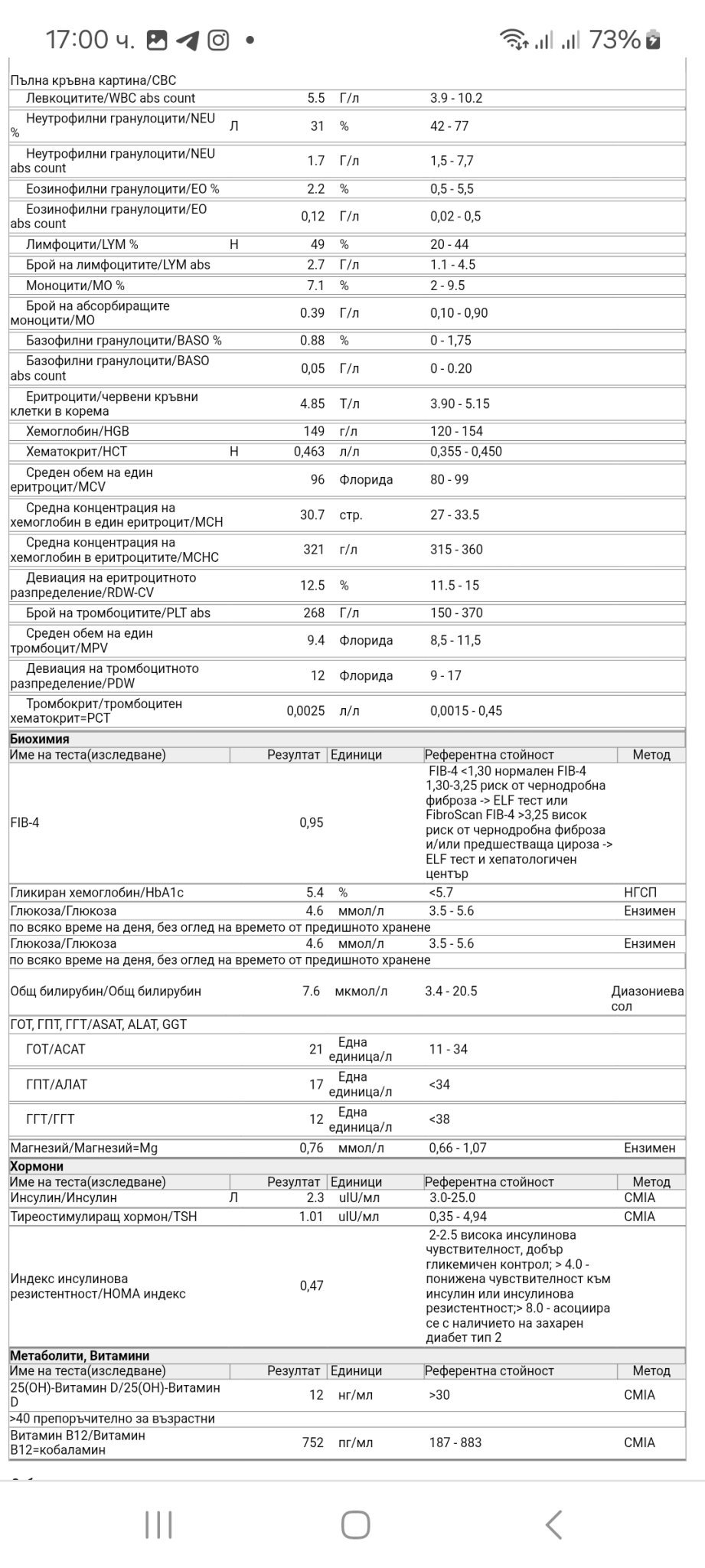 Здравейте, чета ви отдавна , но не съм писала в темата .Моля ви за помощ за разчитане на изследванията . Според линия ми лекар всичко е наред .Има ниски и високи стойности ,които ме притесняват . Всички тук имате богат опит .Благодаря ви предварително .