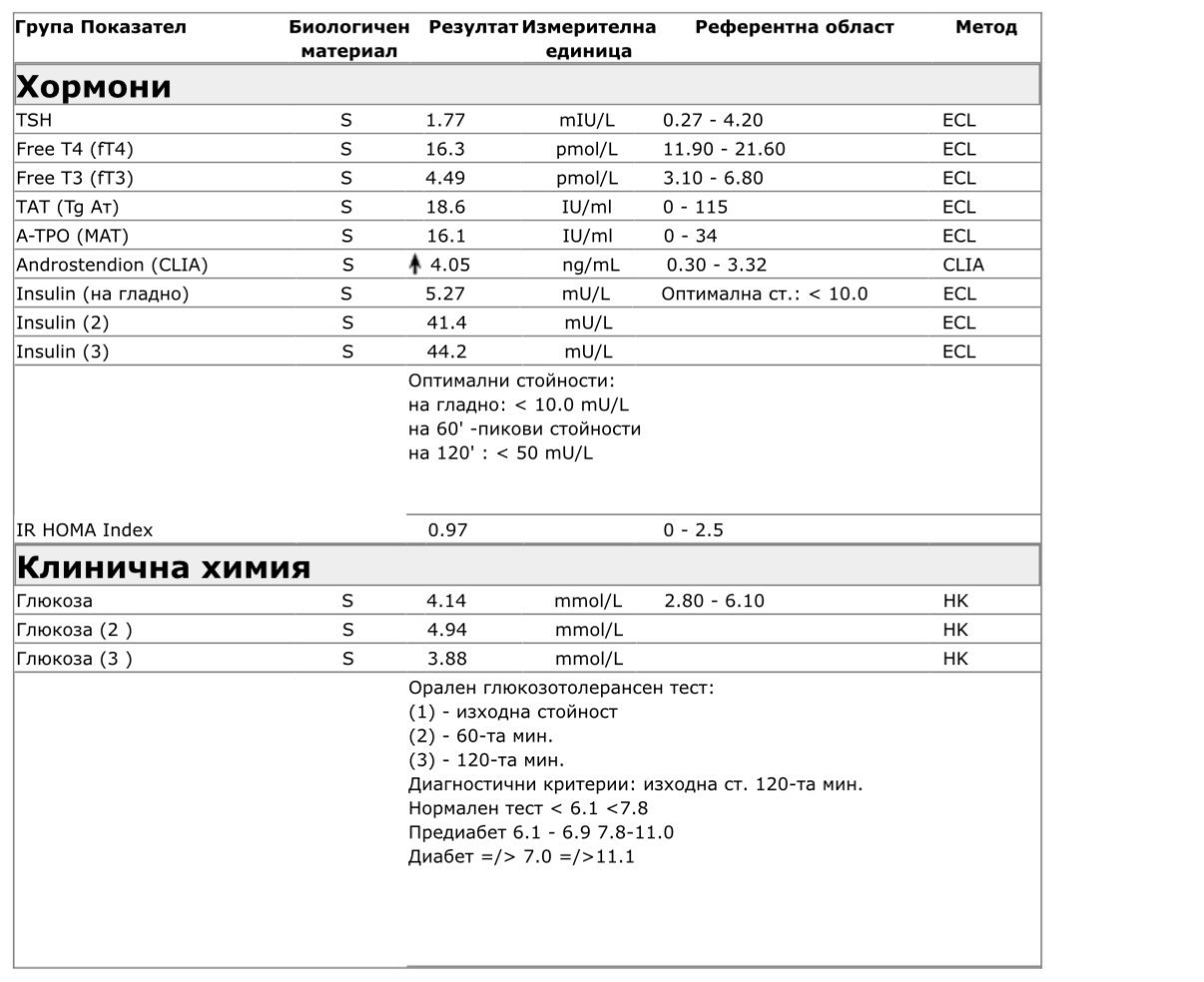 Резултатите от ОГТТ изглеждат привидно добре, КЗ и инсулиът не се покачват много. Обаче инсулинът на втори час не само не е спаднал, ами е и леко нагоре (не е ясно какво се случва след това). Също така, КЗ на втори час е под тази на гладно, което може да е индикация за ИР.