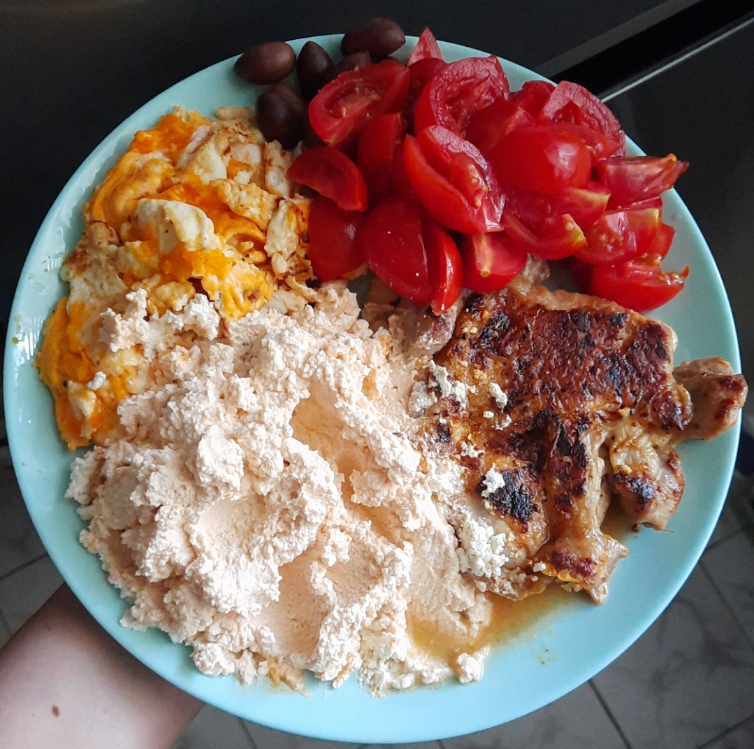 Моята чиния от 18 ч (бъркани яйца, пилешки обезкостен бут с кожа, черита и любима смес от извара, малко сметана и лют сос):