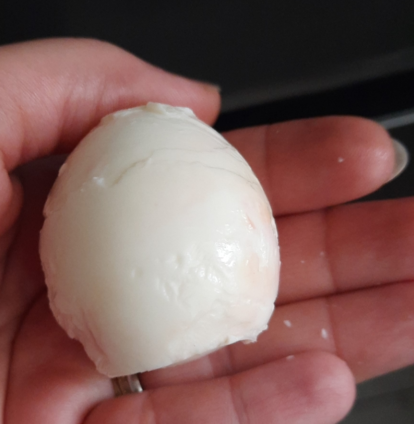 Ето как изглежда едно обелено яйце (от тези, на които ципата им не се отделя лесно от черупката). Обелих го без никакво "дундуркане" и старание да е идеално гладко, буквално за секунди. Подведох се по видеото😂 и започнах да беля яйцето от средната част, иначе по принцип започвам откъм острата част.😀