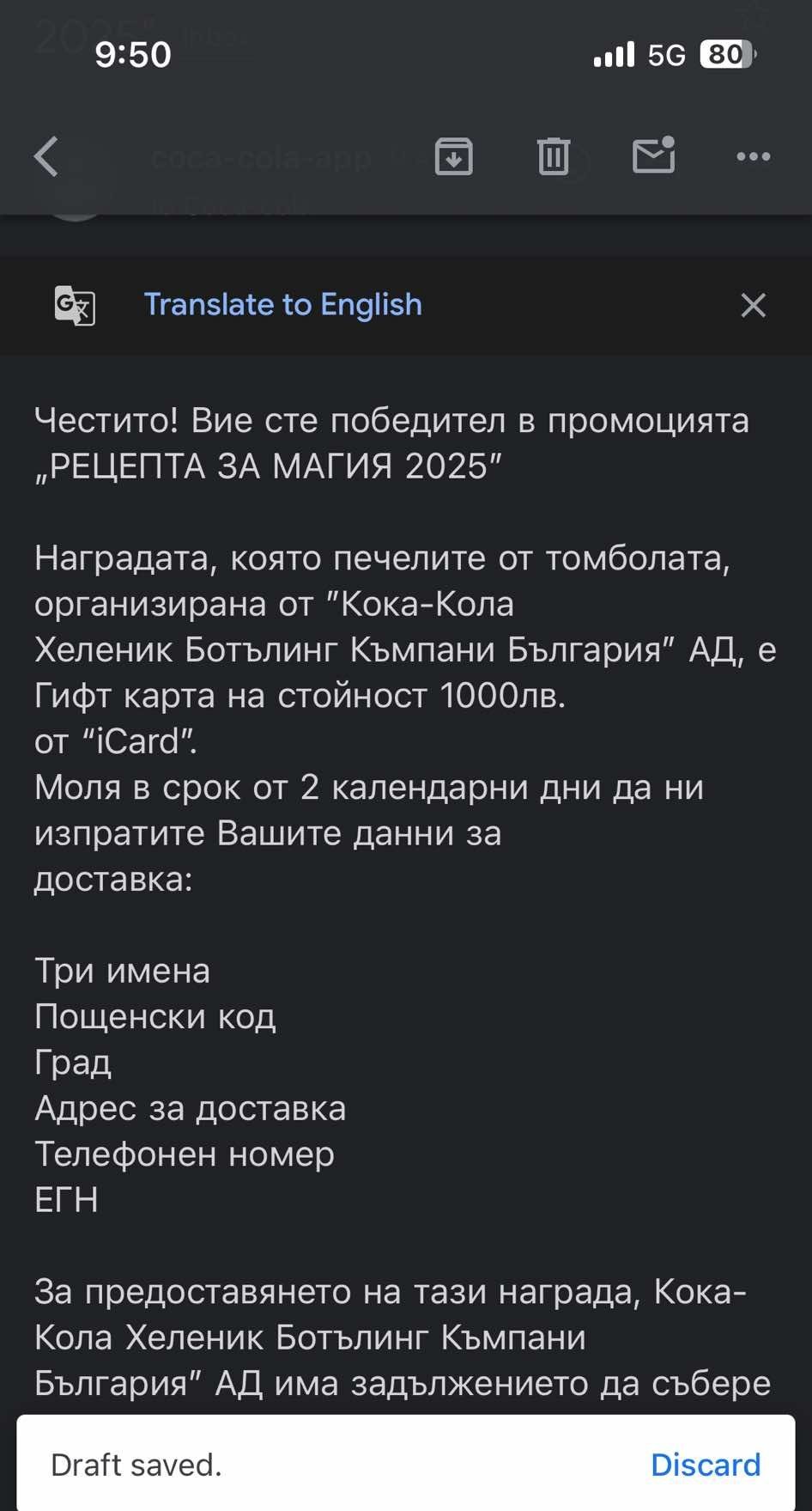 СМС - а е от тази сутрин. Много, много се радвам! Отдавна нищо не бях печелила!