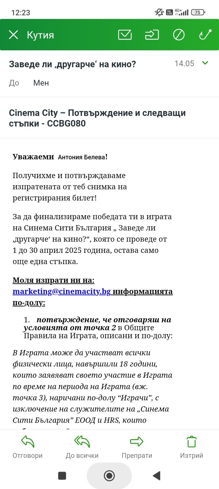Вторият мейл от Синема е от 14.05, виж в папка спам, това е иначе: