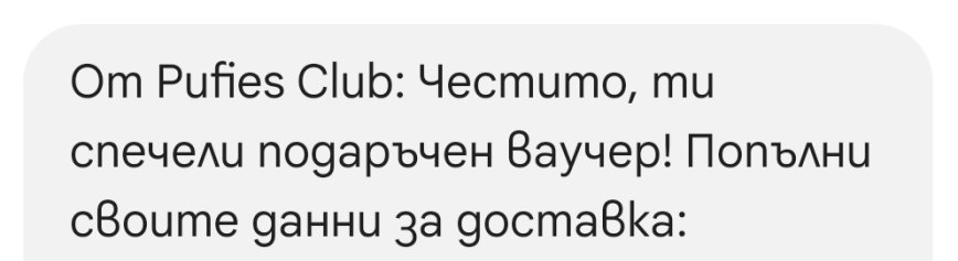 И аз съм със смс от пуфис за ваучер. Днес съм рожденичка и много се зарадвах. След два дни и синът ми има рожден ден...дано получа и някой друг смс😃