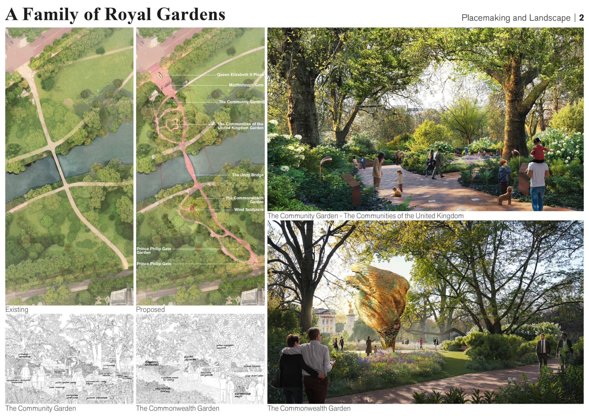 Мемориалът за кралица Елизабет II ще почете нейния живот и наследство чрез пейзаж с разказване на истории около предмети от света, в който е живяла. Централната композиция е оформена от точна отливка на дъб от Големия парк в Уиндзор, представляващ нейната сила, издръжливост и историческото място на монархията, поставен на постамент в езерото. Грациозно извит каменен мост свързва мемориала с околния пейзаж, служейки както като платформа за наблюдение, така и като гражданско пространство. Мемориалната пътека, направена от камъни от цяла Великобритания, започва с новоконфигуриран вход на The Mall и включва много бронзови отливки на значими предмети от живота й, придружени от звуков пейзаж от спомени от тези, на които е повлияла. Нежният, змиевиден дизайн ангажира посетители от всички възрасти и способности, създавайки траен символ на нейното наследство, като същевременно се интегрира безпроблемно в историческия пейзаж.