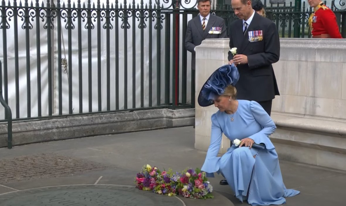 Принцесата на Уелс, кралица Камила, Принцеса Ан и херцогинята на Единбург полагат цветя на Мемориала на невинните жертви след службата за Деня на благодарността в чест на 80-годишнината от Деня на победата в Уестминстърското абатство.