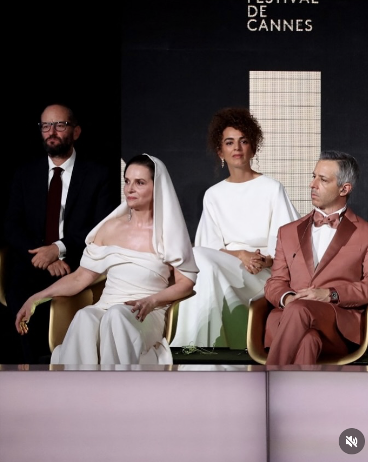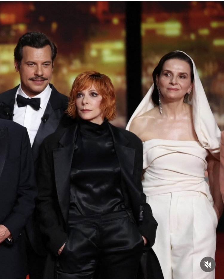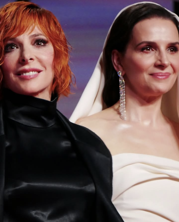 Президентшата Жулиет Бинош се появи с бял тоалет, панталон с ръб, заметнат бял воал над косите като истинска Мадона, с тежка висяща обица обсипана с камъни на непокритото ухо, без никакви други бижута, стилна, прекрасна, цялата блестеше, в пряк и преносен смисъл, беше красиво видение, такива бяха и думите й.