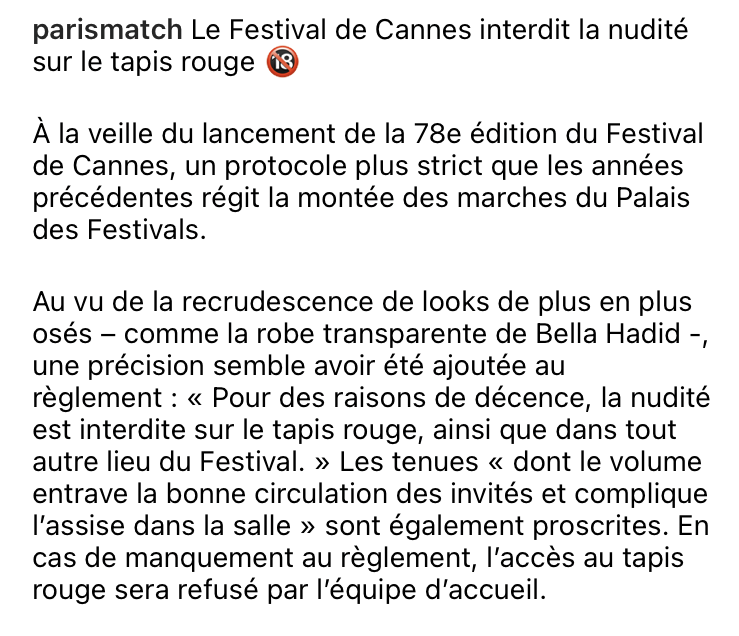 Прилагам текста на френски, ПариМач го публикува и изрично е постановено, че се затяга регламента от тази година, “не се допускат голотии, както и прекалено обемисти тоалети, които биха затруднили циркулирането по червения килим и безпроблемното настаняване във фестивалната зала” (тези уточнения ми харесаха🙃🙈💪). Затягането на условията не важи само за The Red Carpet, но и за всяко друго място, свързано с кинофестивала.