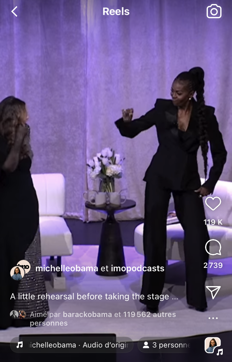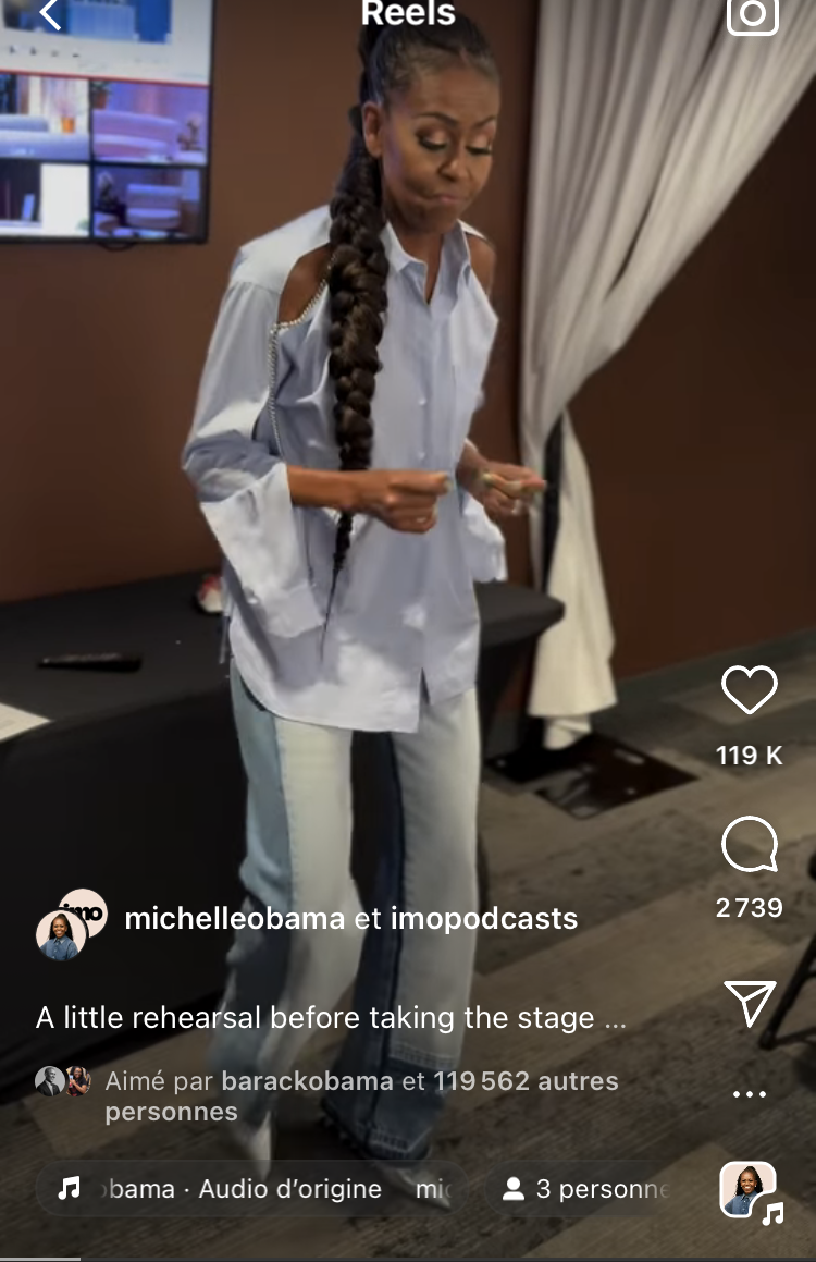 Мишел Обама действително се е свършила. Репетира за танца с майката на Бионсе. После на сцената буквално е неузнаваема, крайно слаб силует. Но танцува с настроение.