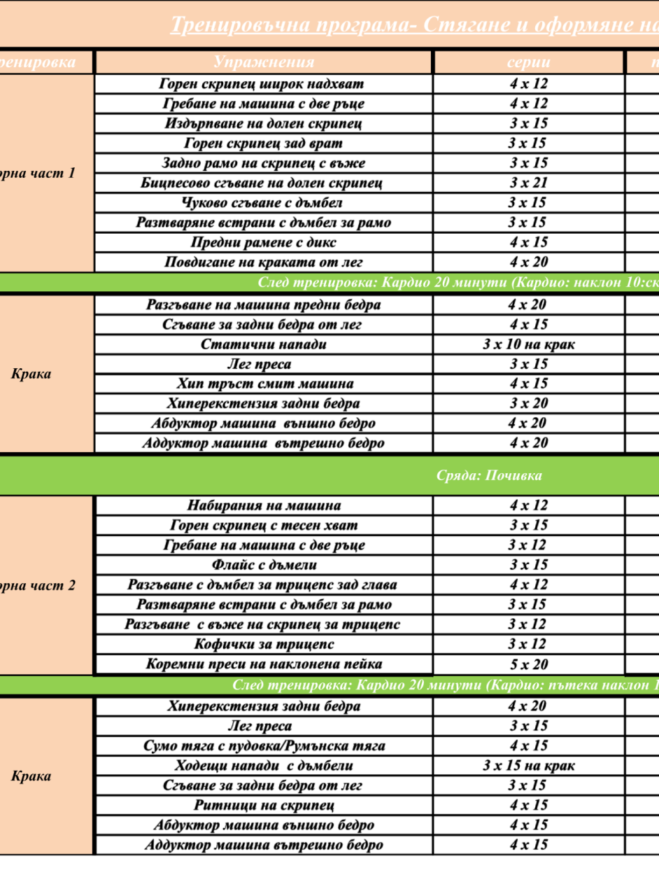 Направиха ми програма за тренировки, моля за вашето мнение. Като имайте предвид, че тренирам 3-4 дни и после почивам 2 и пак почвам.