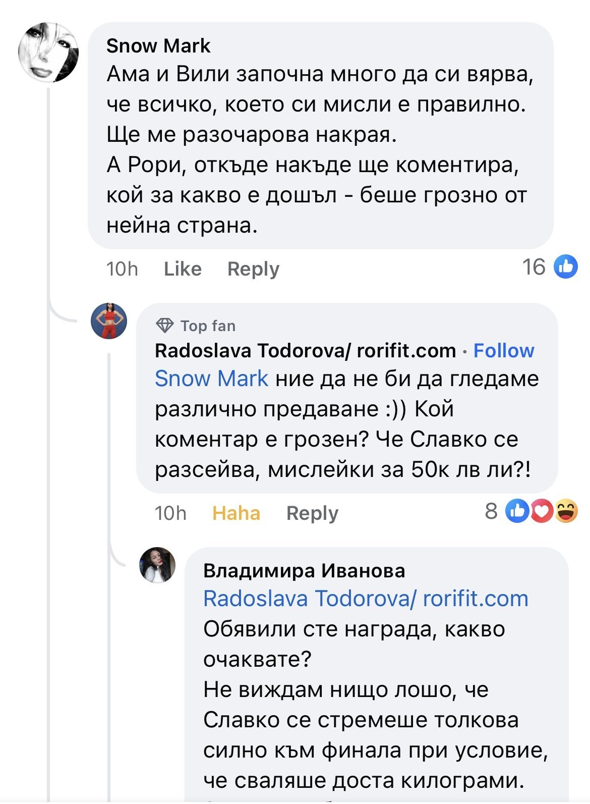 Мен ми направи впечатление снощи Рори, как каза за Славко, че бил мислил за финала и му се изместил фокуса. А нейния Тодореско, който не искаше да тренира както тя му кажеше и не ядеше за да има по-добри резултати на кантара, неговия фокус изобщо не е насочен към финала. Ванко, един път не чух да се изкаже за червените, просто си каза че не харесва Тодор, кратко и ясно.
