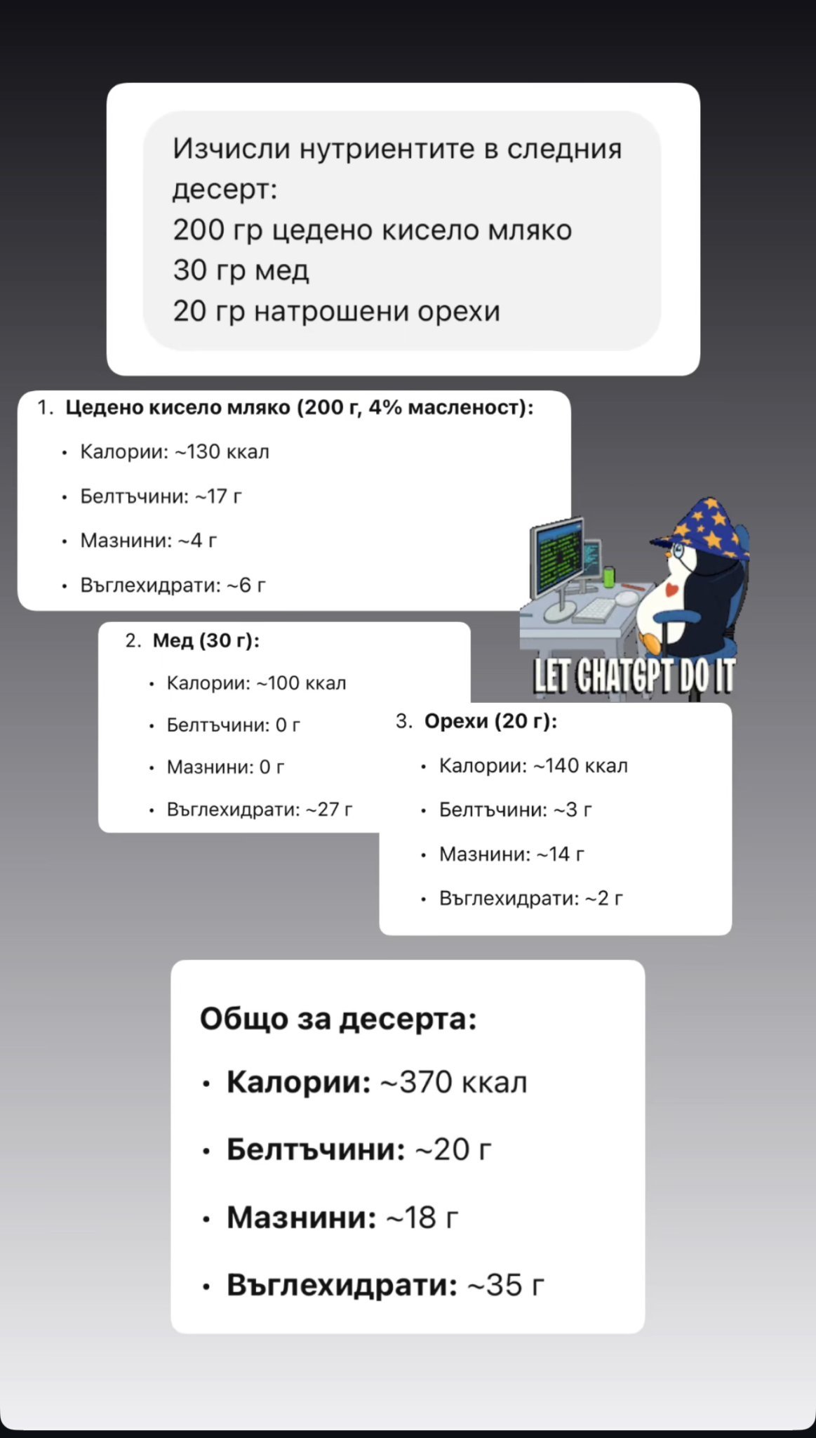 Само дето си мисли, че това е здравословен десерт, където млякото само името му е мляко и е с нишестета Simple Smile медът е от евтините ментета, с глюкоза и аромати, а орехите най-вероятно не са киснати и  си носят фитиновата киселина... и докато брои калориите и не гледа какъв рязък скок на гликемичен индекс има този псевдо десерт... може да се мисли за умна Simple Smile