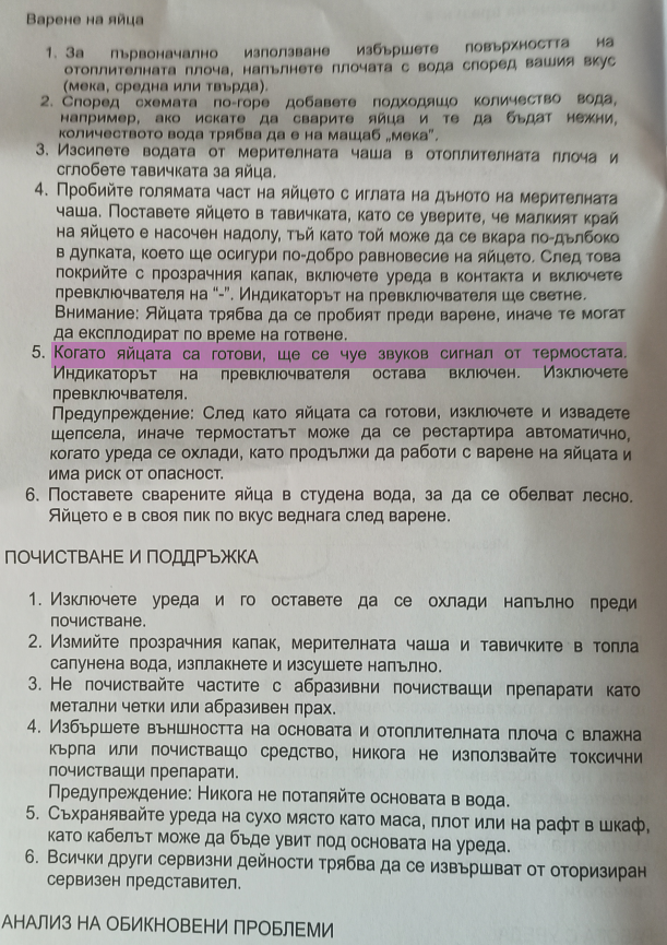 На описанието на яйцеварката пише, че ще има звуков сигнал, но уви... Взех си я защото на работа един от колегите докара подобнa (друга измислена марка) и смятам, че е доста удобен уред, особено КОГАТО РАБОТИ както трябва. Добре, че живея близо до Кауфланд, че бая разходи щях да пръсна за тези 2 връщания.