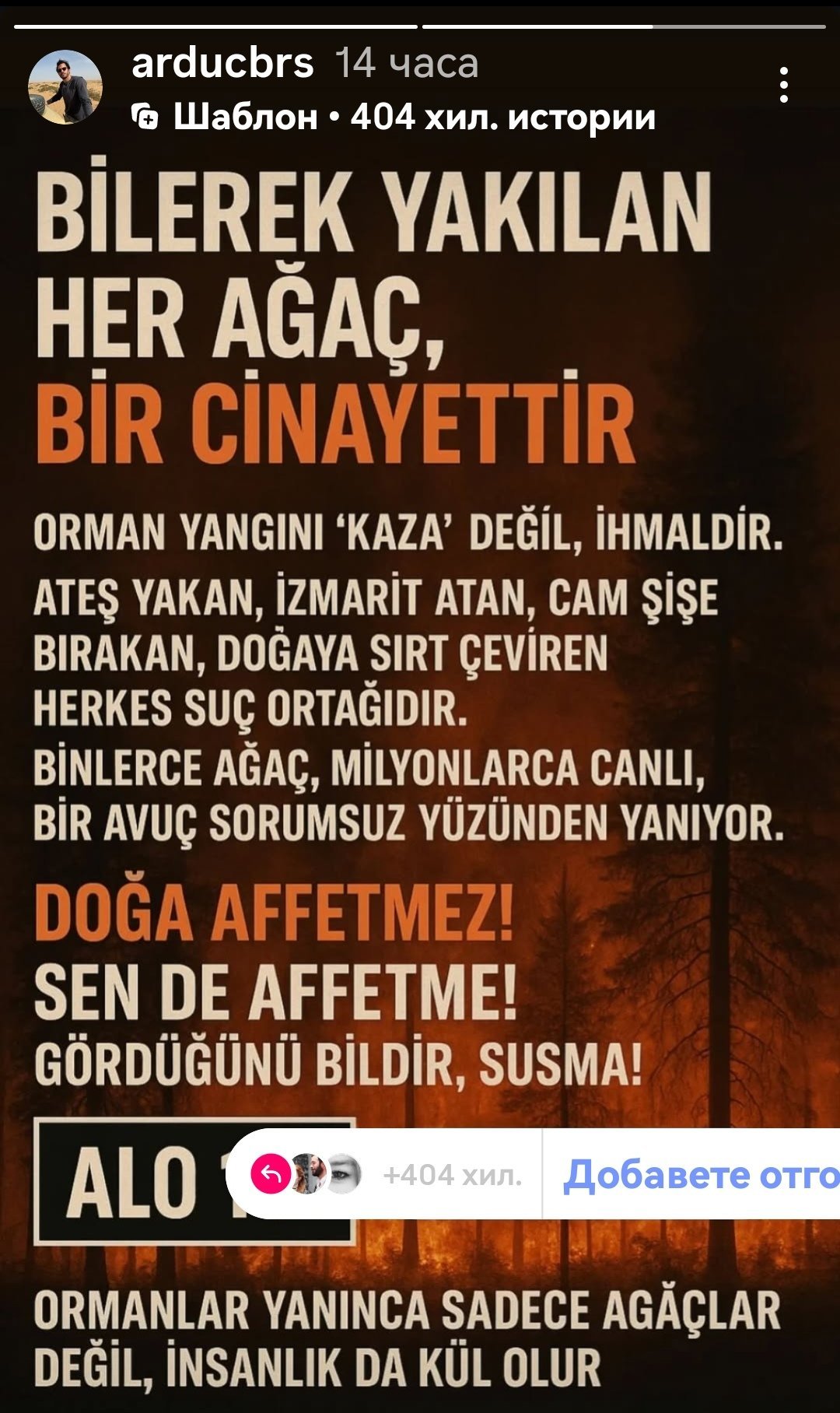 "Вижте, това не е просто някакъв пожар, това е бедствие, бедствие се случва точно сега, бедствие, което е достигнало домовете, достигнало е града и не може да бъде потушено! Всички хора в Измир и всички живи същества са под голяма заплаха, ние също чакаме безпомощно пожара, чакаме нащрек да получим новини всеки момент, без да спим. Направете нещо сега. Измир Гори"