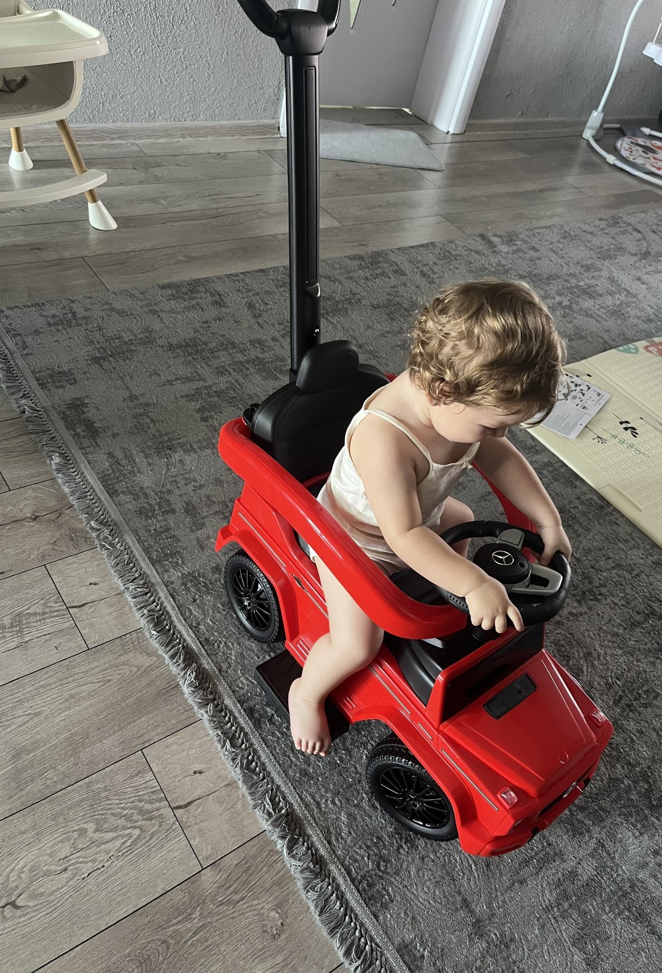 На тези коли се ползва пластмасовия обръч и не падат, като поотраснат, махате дръжката и обръча и си бута с крачетата колата.