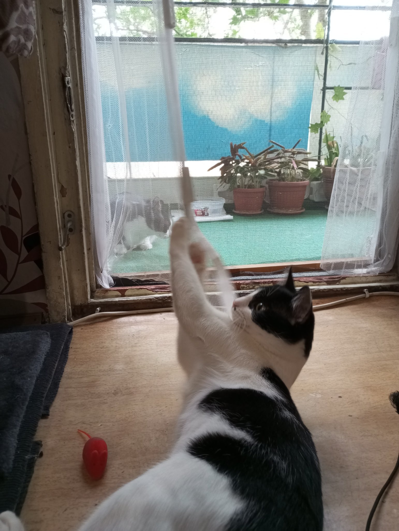 Да свършва този ремонт... Вчера Магито излезе на двора, но тя първо задължително се търкаля. Леле, като я видях-сива от прахоляка, 5 минути я отупвах, докато черните петна станат черни. Вече на ръце я изнасям до горната част на градината. И на ръце я внасям.