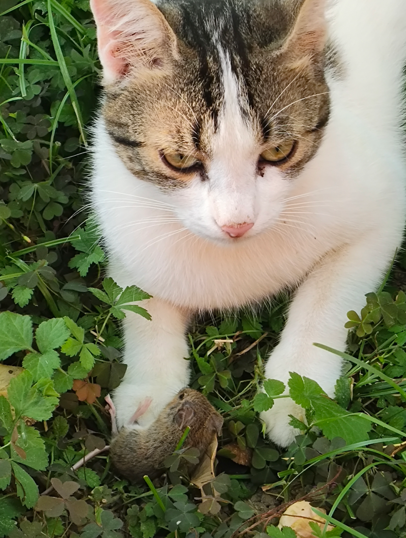 Тази сутрин Лео влезе през прозореца с боен вик, в 5.30 сутринта! Събудих се шашната, защото познах вика. Така мяука Точка като носи улов. И гледам - нашият Лео с мишка в уста. И много гордо ми я оставя до леглото ( слава богу умряла, че по принцип си ги носи живи). Такъв крясък съм надала, че мъжът ми и той скочи 😂