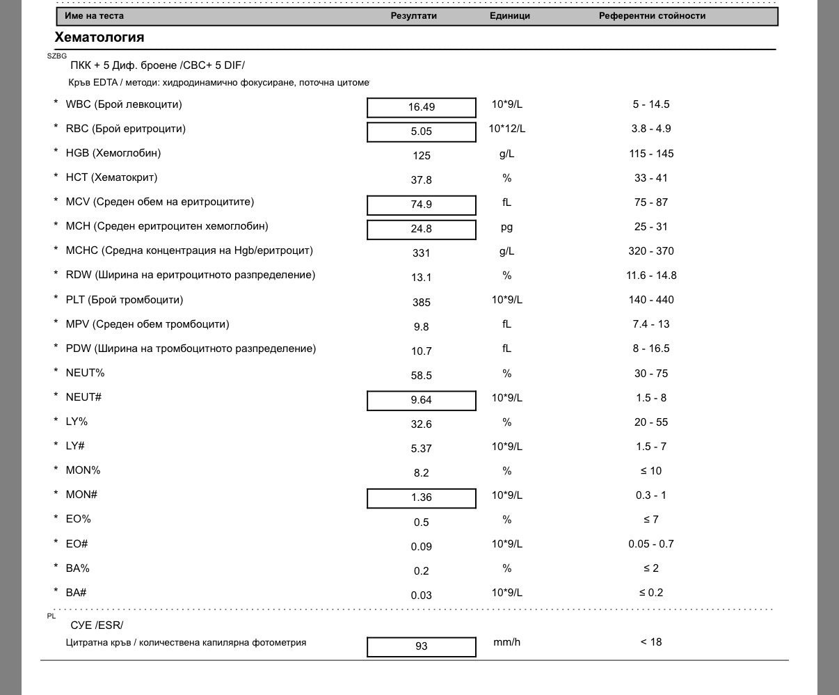 Здравейте,момичета! Вече месец се влачим болни с моя младеж. Това са му резултати от днес,защото снощи вдигна Т. Црп-то е 60. Той освен Т няма оплаквания. ЛЛ го прегледа и даде АБ и уж,имал налепи по гърлото. Вече нз от нерви къде се намирам Sad Надявам се вашите мъници да са добре и да споделите има ли такъв вирус само с Т и такива кофти показатели и АБ ли се дава веднага. Оплаках се и ми оплекна.