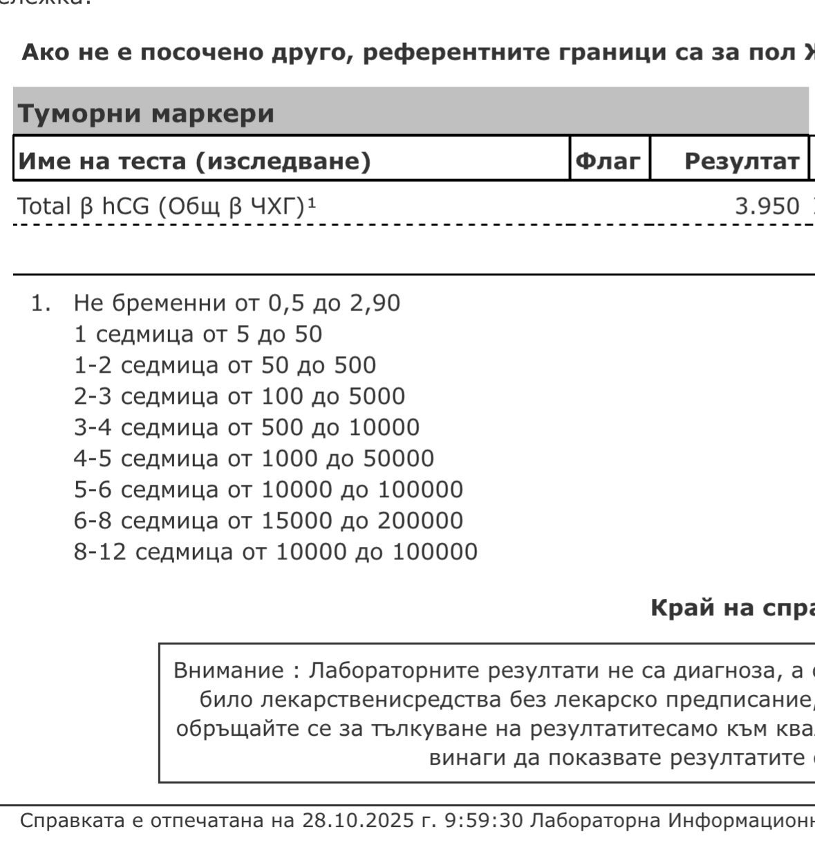 Благодаря, но ми стана странно, защото пише не бременни стойностите са от 0 до 2,9, а моята е 3,950, но пък и не се вписва от седмица 1, ва която пък е от 5 до 50, стойността ми не съвпада никъде.