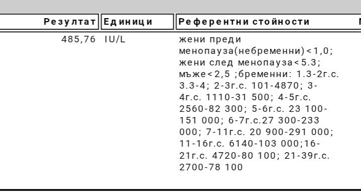 Четох в Интернет и видях, че референтните стойности, които са дали са други и според тях е ок. С първата бременност правих тест в сушата лаборатория и тогава резултата беше 186,5 mU/ml и референтните стойности бяха: