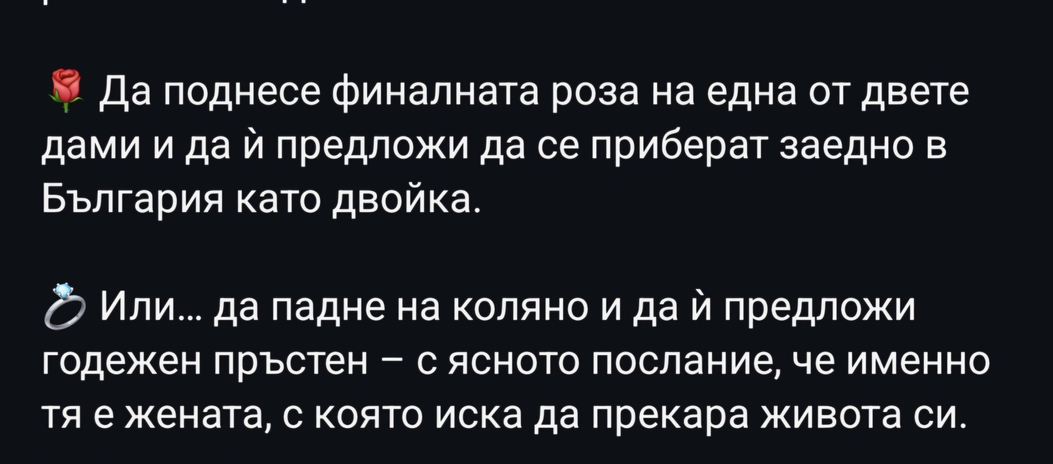 И да, по анкетата...Мисля, че Виктор ще даде роза на Любомира, но ще си спастри пръстена Smiley