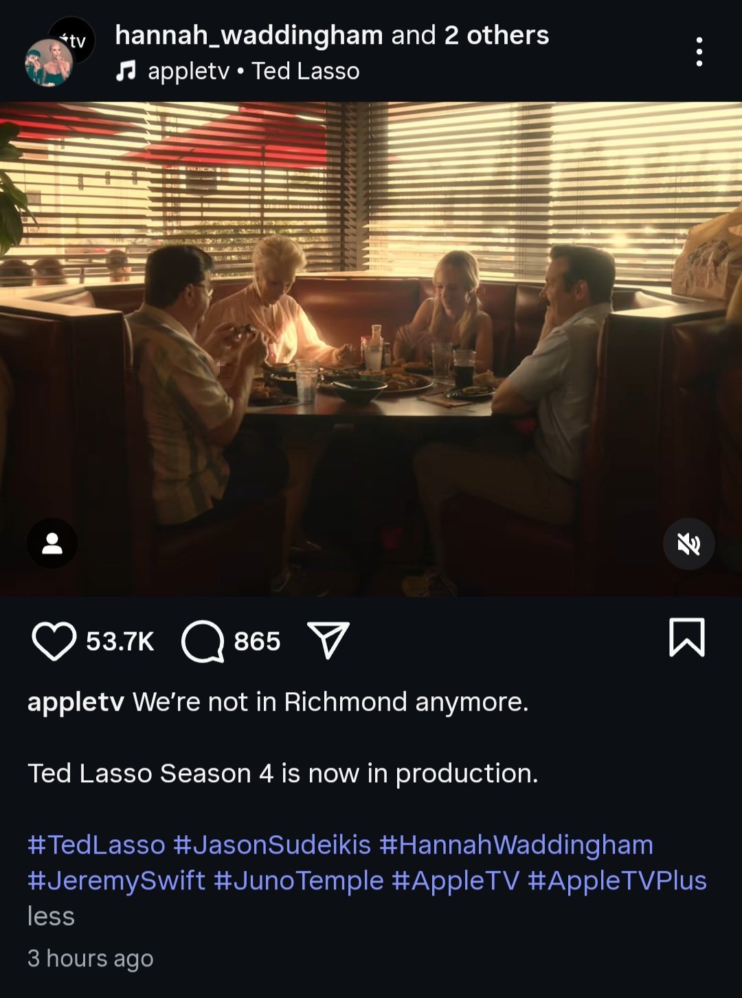 Бях скрийншотнала пост на Хана Уодингам на 21 юли, че са започнали снимки на четвърти сезон на Ted Lasso (Apple TV+), но все забравям да го споделя тук.