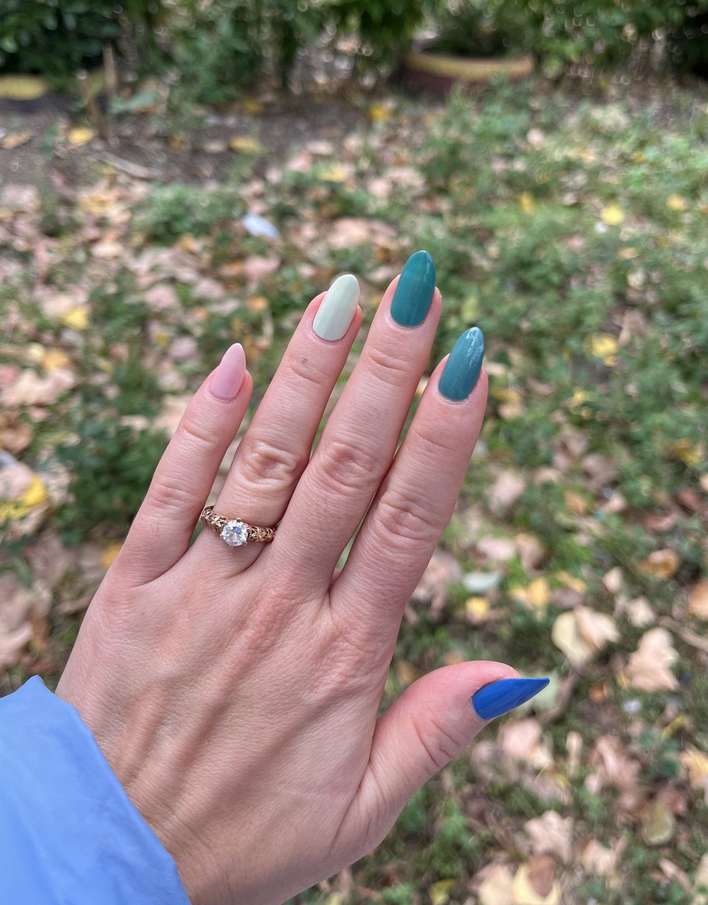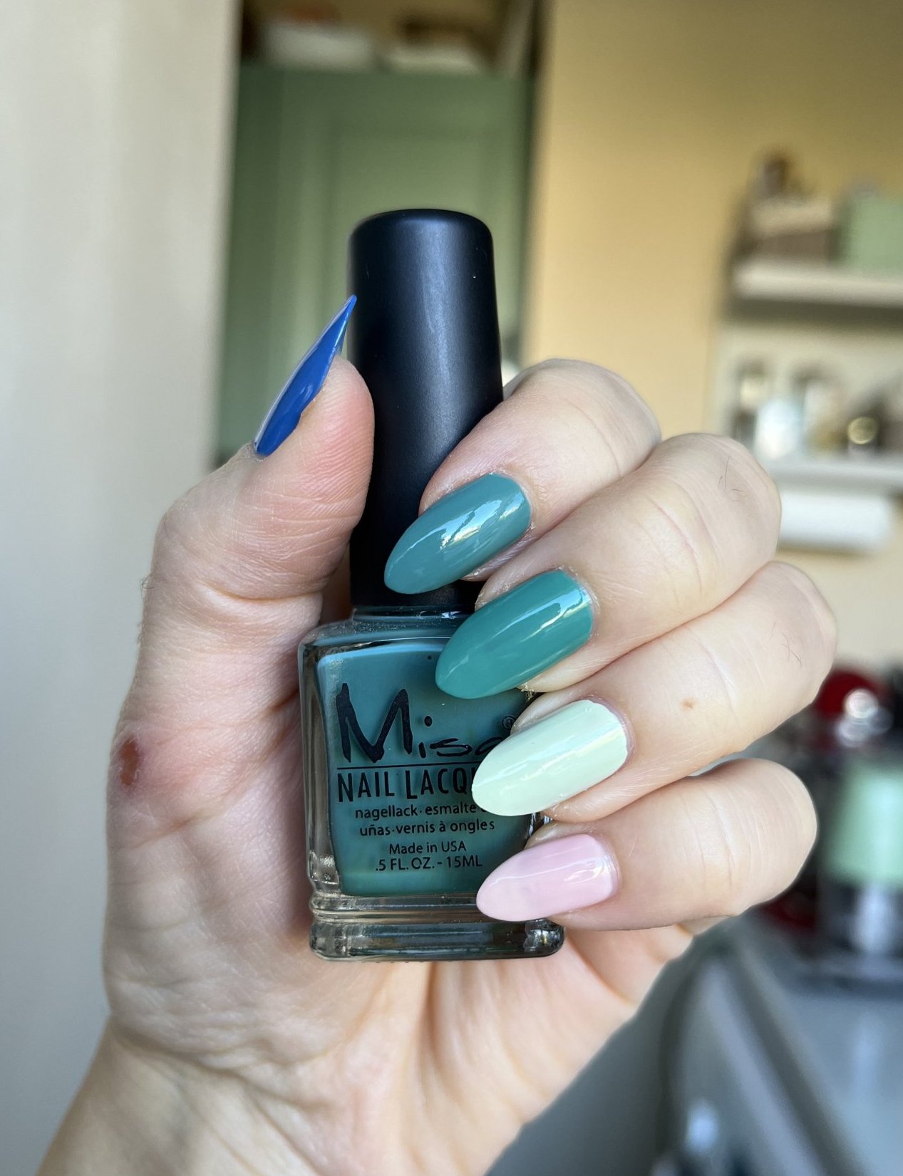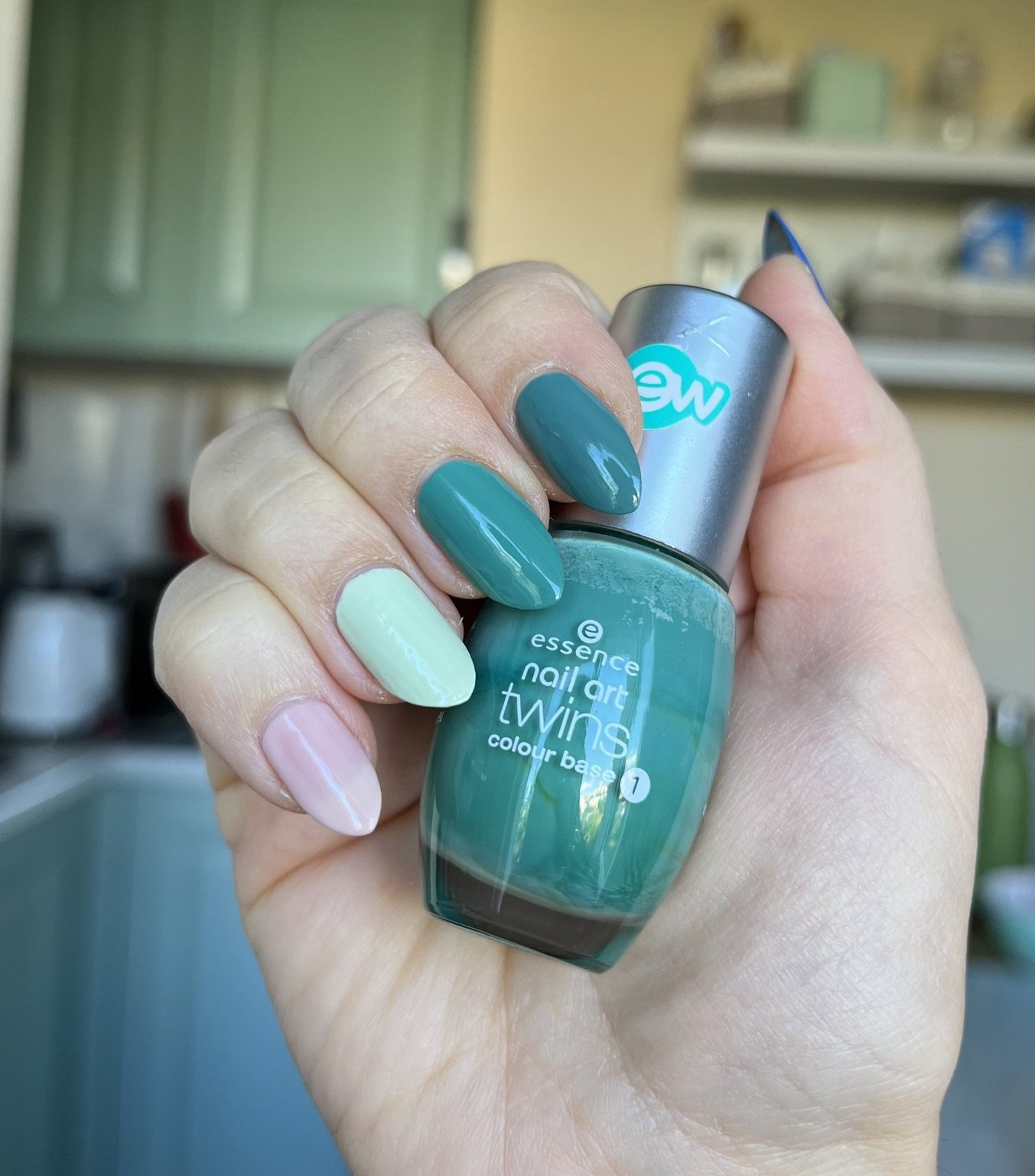 Много големи колебания имах в каква гама да се лакирам днес и посегнах към тази омбре комбинация в зелено. Почти сме се мачнали с Пампита. 😇