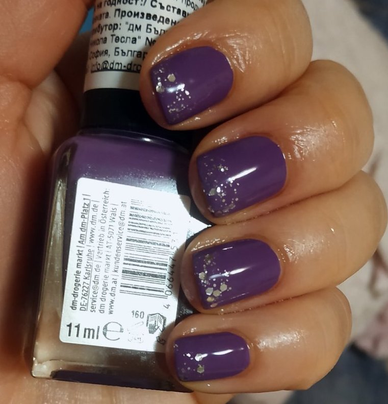Глитърните сребърни точки са някакъв китаец без номер, с прозрачна база, която беше много гъста. Едва го нанесох с гъбичка.
