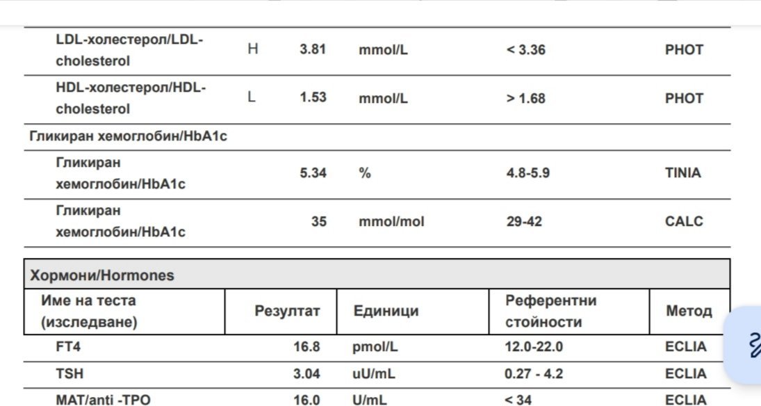 Прибирам се с резултати от вчерашно изследване по искане на ендокринолог, пуснато на база оплакванията ми за натрупани отново кг и страшен апетит за сладко. Пулсът ми е нормален, сърцебиене нямам. Постоянно ми е студено, вечно ми се спи, нямам сила, бързо се уморявам. ТСХ видно е "повече от прекрасно". От 2 години са ми спряни хапчетата, всякакви- еутирокс, елтироксин, метфокон. Часът ми за среща с ендокринолога е след месец. Интересува ме как разчитате изследванията. Ккакви изводи могат да се направят?