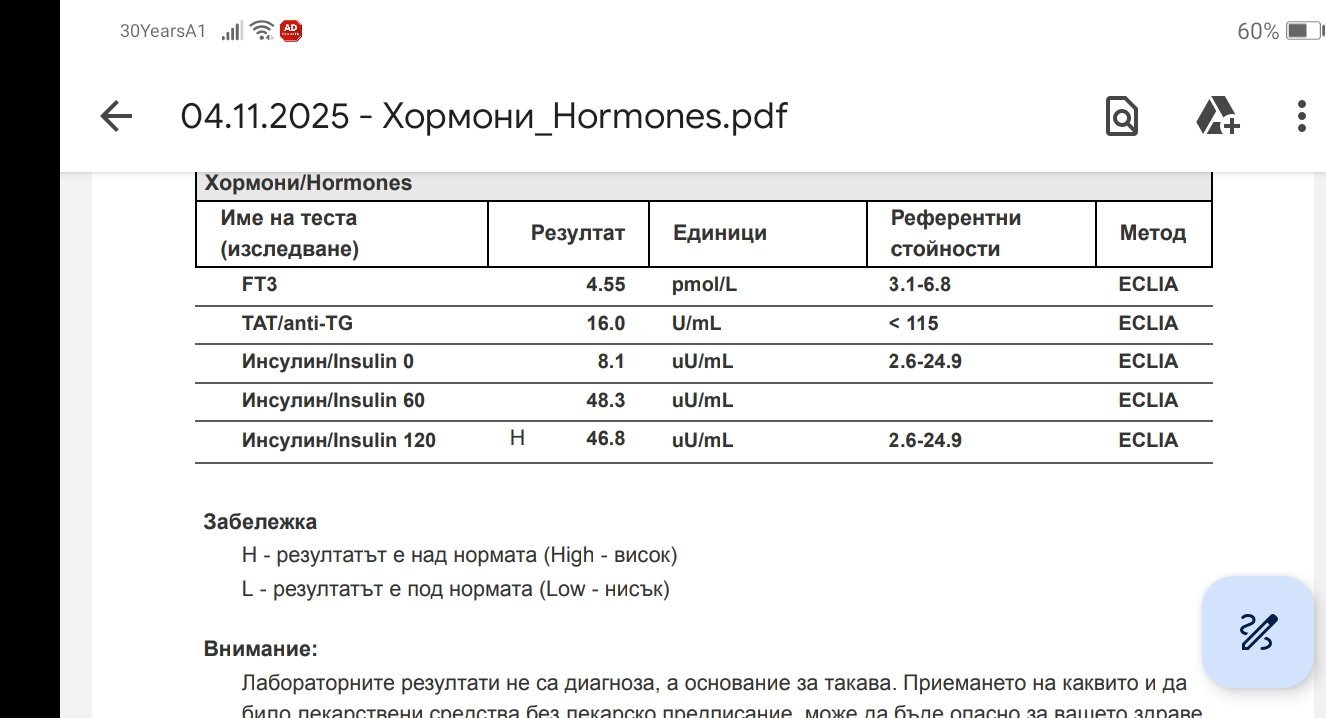 Стойностите ти не са за диабет. ИР е. Но трябва да поработиш върху устойчив режим.