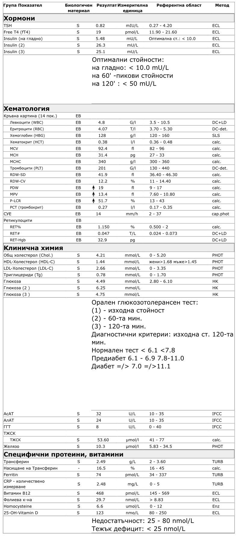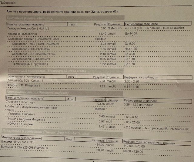 Вит. Д нисък, триглицериди неоптимални, захар неоптимална, все още инсулинът държи фронта, но… Посоката не е добра, но все още има време да се оправи всичко без никакви лекарства, а само с изчистена храна.