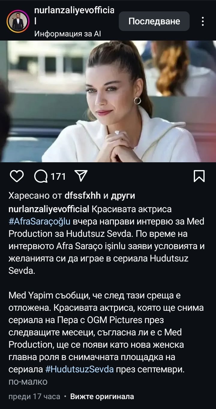 Това за "Безгранична любов" било фейк новина,но за "Пера" и рекламния филм с Енгин Акюрек си е потвърдено.Яд ме е само,че Афра ще продължи с ОГМ и те отново ще се възползват от нея.Дано проекта да е успешен,че като им гледам сценаристите тръпки ме побиват.Не може втори проект да се "държи" само на таланта на една актриса.