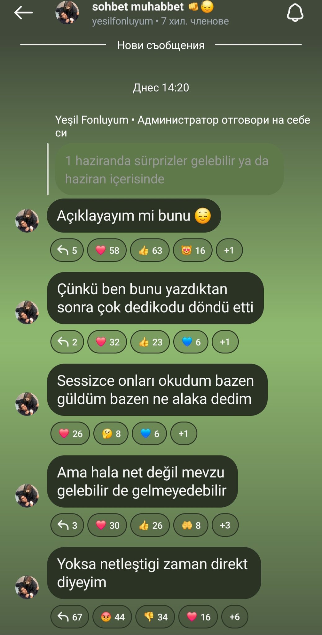 Зеления фон ще каже в събота, каква е онази юнска изненада. Относно Мерт била. Не било уточнено още, но много клюки излезли, та ще си напише и тя, какво има да казва хахах