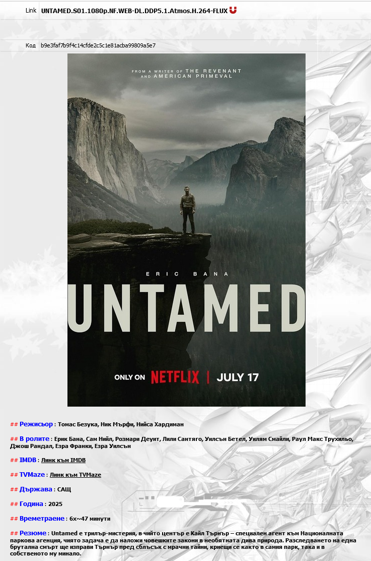 Появил се е Untamed - целият С01 накуп, обаче още липсват субтитрите. Ерик Бана, според мен е сниман за постера върху "Езика на трола". (Все пак, ще чакам субтитри.)