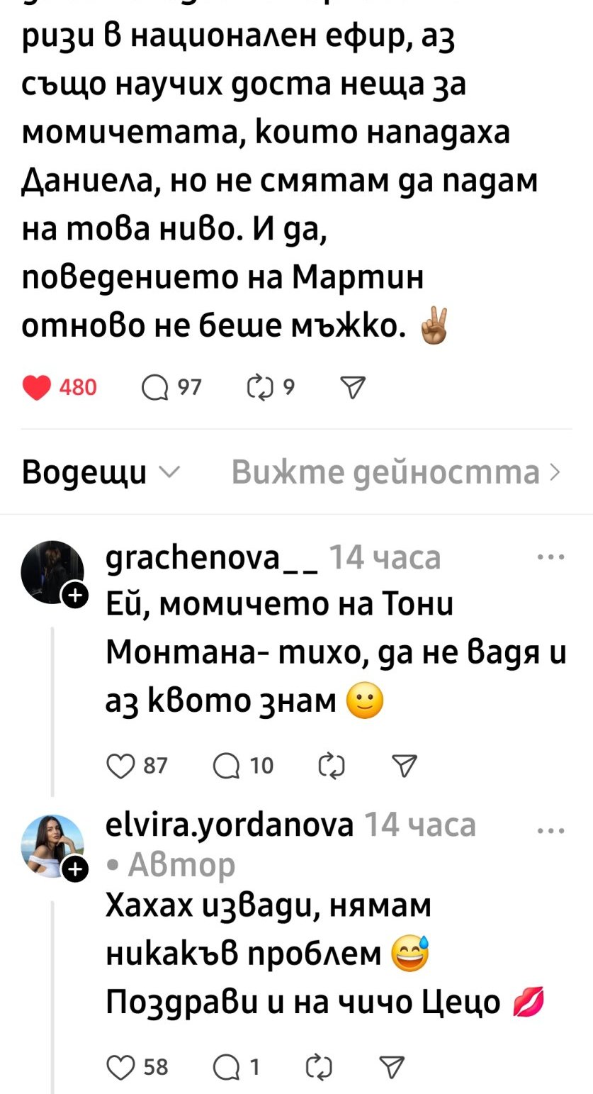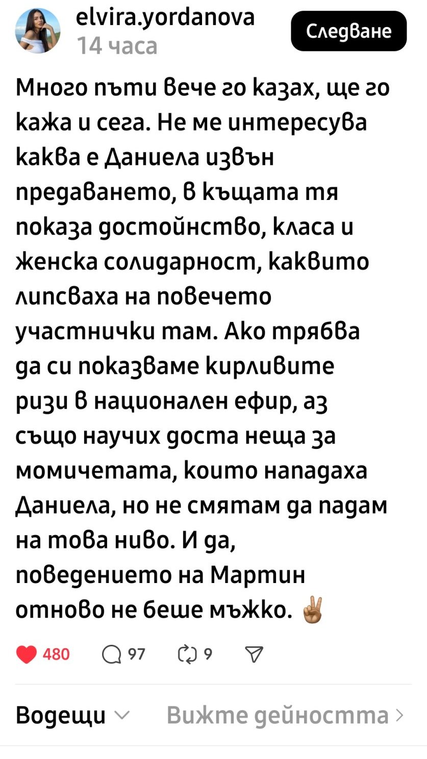 Няма да се учудя ако всичко между Мартин и Даниела е постановка. Целият интернет е гръмнал. Според мен те са имали уговорка за връзка само в шоуто и сега разиграват зрителите.
