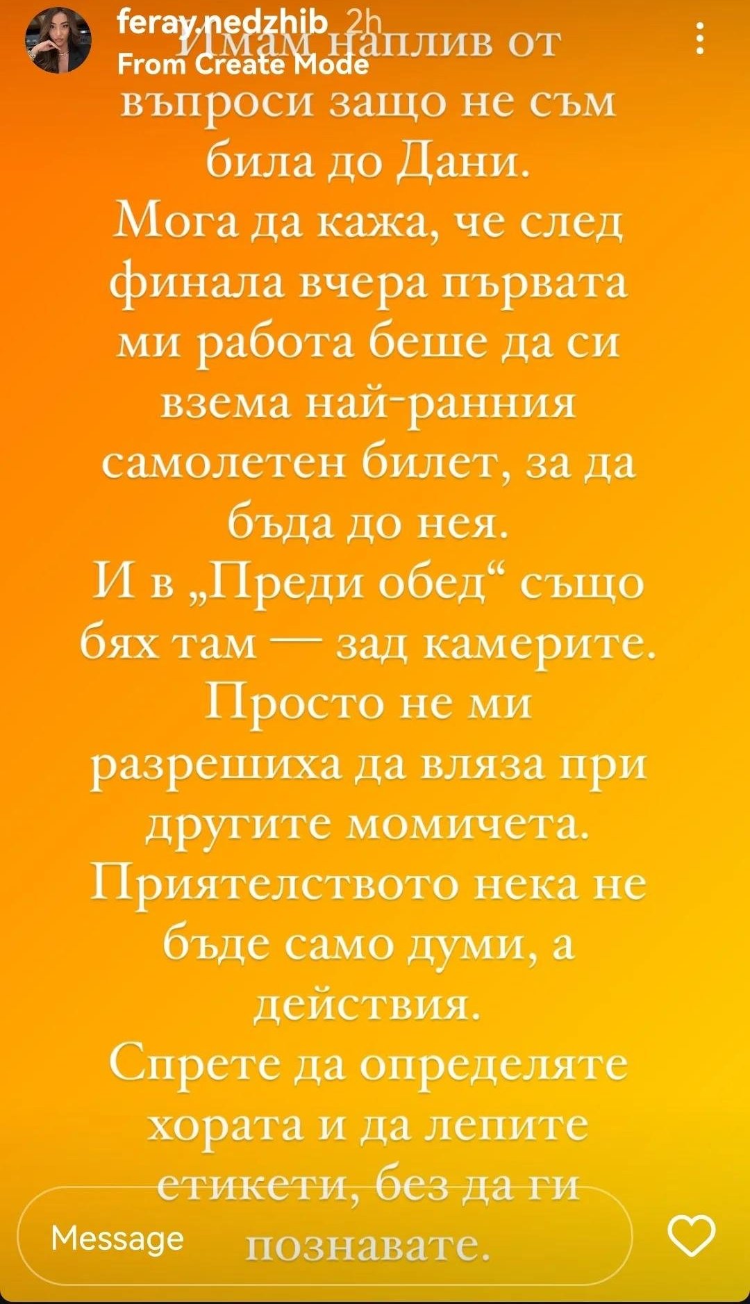 Хайде, няма нужда, който е безгрешен, пръв да хвърли камък. Даниела, че не беше искрена е вярно, но останалите нали са чиста вода ненапита. Просто не бяха на такъв фокус и останаха на заден план. Сигурна съм, че Ана-Мария знае по нещо за всеки един участник.Joy