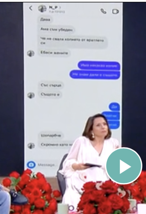 Гледах по-внимателно ПО. Тия хора старателно са се подготвяли да я разкостят. Качили са на екрана зад гърба на водещата скрийншот от чата за колието, който цитира продуцентът?!? Николов просто продължава да се грижи за рейтинга на шоуто и след финала и да ви кажа, не бих се учудила, да са уговаряли с Мартин сценария и наратива в студиото тази сутрин. Сам призна, че плакал от радост, че на финала имало годеж с пръстен и явно много е разочарован, че идеята му за предване - истинско, искрено, само за любов, за пред децата и родителите им и т.н, не е завършило с хепиенд. Качвам най-ясния скрийншот, който успях да направя. Чатът бил с един от редакторите на шоуто. От чата излиза, че този, който пише за колието, потвърждава, че е същото, което тя не сваляла от врата си и се възмущава от жените. Така че това да е любовникът с 500-те рози и мезонетът, не ми се връзва. Много клюкарска и интригантска история. Чудно ми е кой е на снимката и инициалите в горния ъгъл, но е доста неясно.