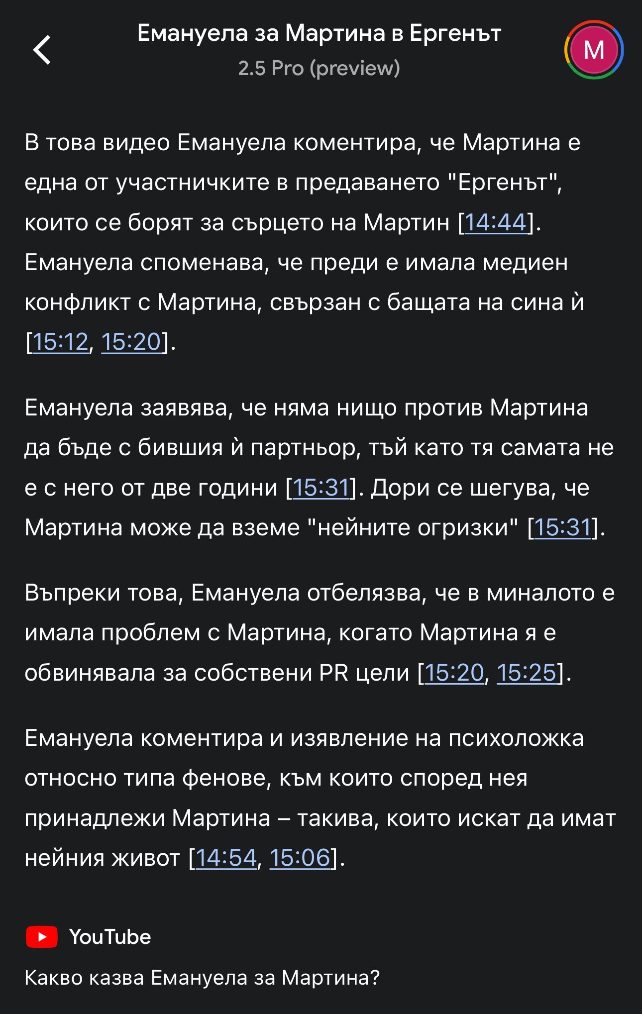 Това е какво е казала за Мартина относно участието и в Ергена, преди 2 месеца в coolt. То май до сега това е и единственото предаване където е коментирала Ергена и участващите в него. Не я храни много, и едва ли има желание да и вдига акциите кой знае колко много.