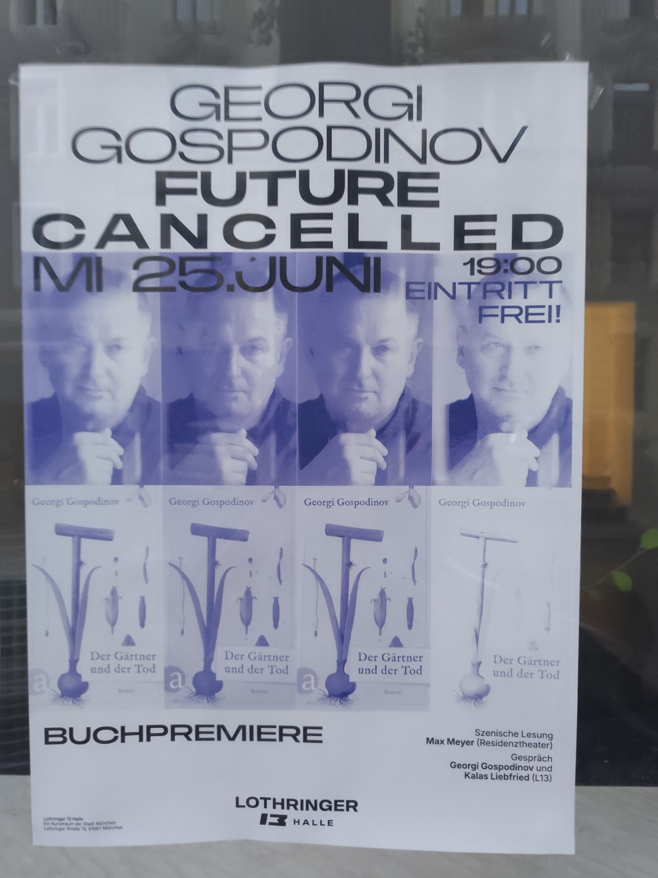 Аз минавам само да споделя едно литературно събитие, на което присъствах вчера. В много камерен състав, не знам защо така, представиха изданието на "Градинарят и смъртта" на немски - за пръв път се публикува на този език. Георги Господинов присъства, беше забавно, защото срещата се проведе на три езика, английски, немски и български и имаше четене на откъси от "Времеубежище" и "Градинарят и смъртта". Беше доста интересно, разказва за това как е започнал да пише поезия, после как е преминал към новелите, разказа спомени за баща си и за последните му мигове и за това как се е появила "Градинарят и смъртта". Много приятен и сладкодумен мъж, жалко, че нямаше повече време и повече хора. Самото място, на което се състоя представянето беше интересно - имаше експозиция на български творци, като имаше арт инсталация, свързана точно с времето и с това, че природата е наше убежище. А на входа публиката беше посрещната от електронно табло, което беше като табло за полети и пишеше, че бъдещето е отменено