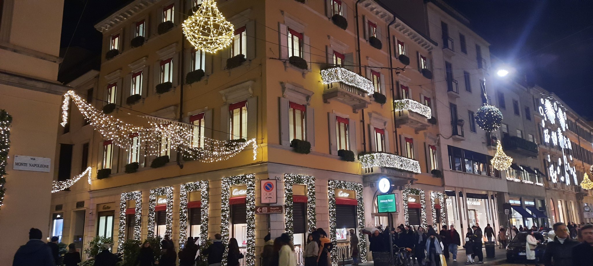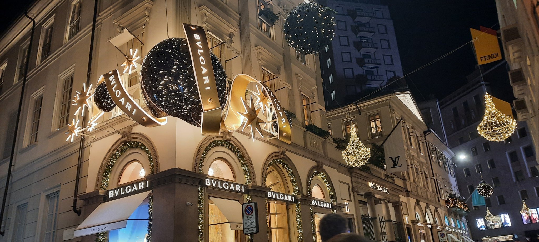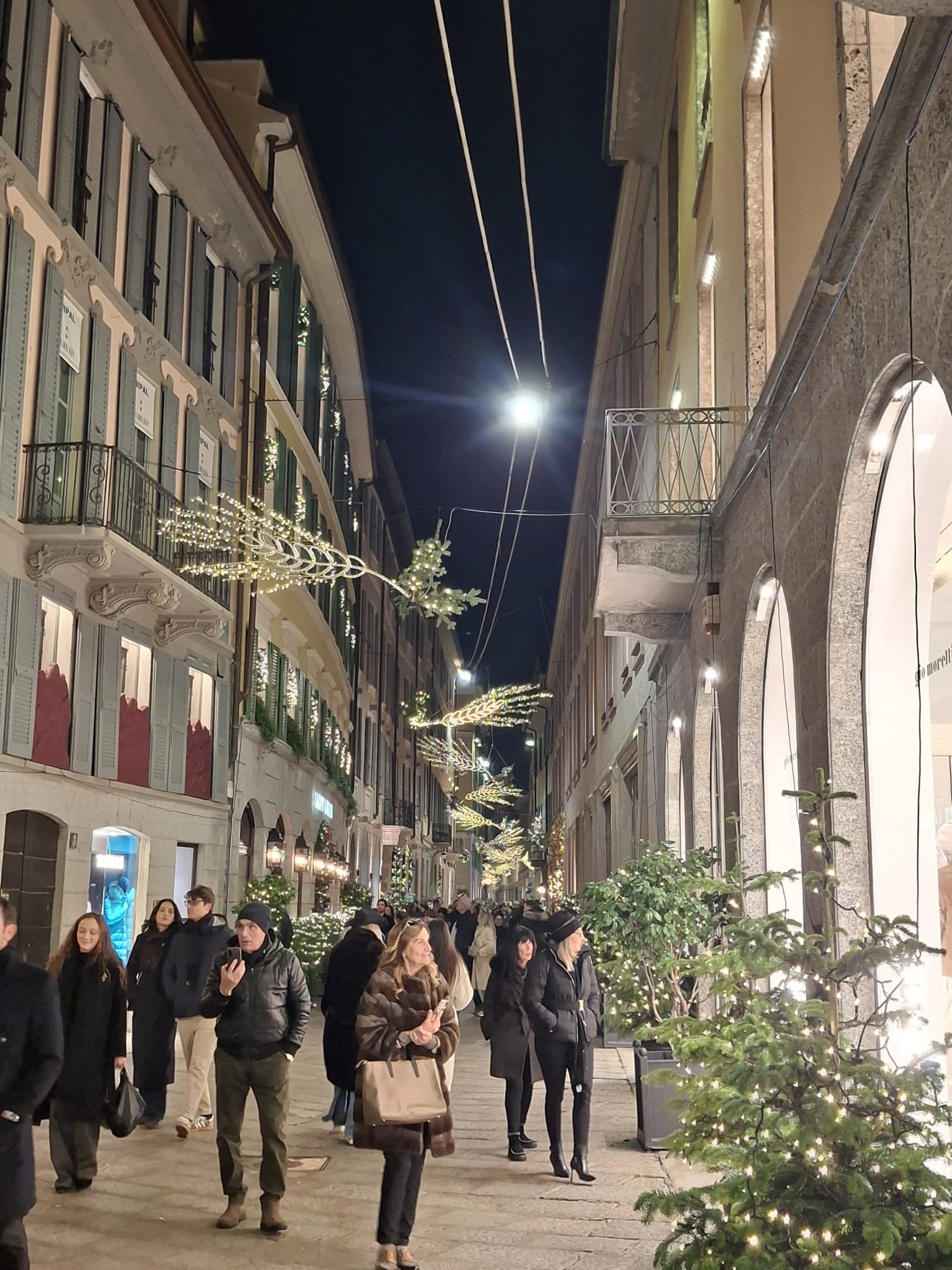 Украса по via Montenapoleone, бях я пускала на дневна светлина, сега на вечерна: