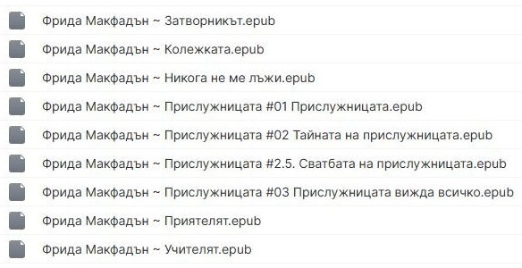 След като прочетох поредицата “Прислужницата” и “Учителят”, търся други книги на Фрида Макфадън. biki@abv.bg