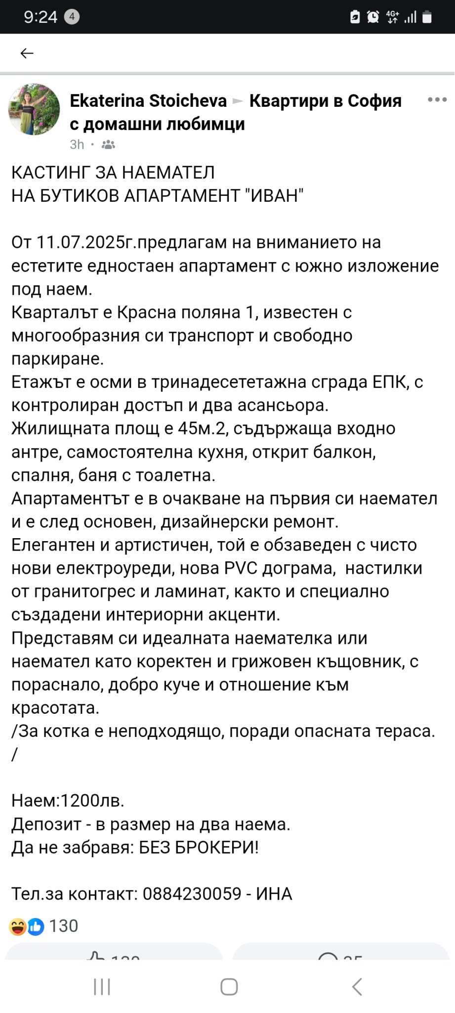 Не съм сигурна вече дали има реални обяви в групите във фейса. Или ако има са не повече от 10%. Онзи ден нещо си ровя и гледам обява на апартамент, който ми е познат. Заглеждам се- то мой апартамент🤦🤦. Откраднати снимки, цена с 30% по- ниска от когато го отдадох преди година. Писах и на админи, и отдолу коментирах, вече втори ден нищо не е изтрито.