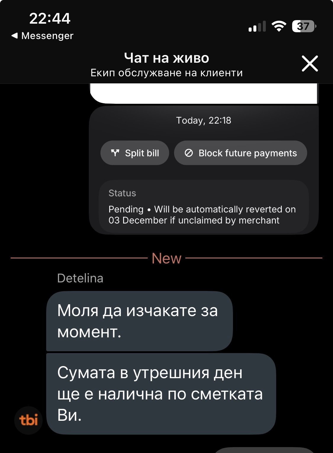 При захранване на neon карта от приложението на TBI, от карта в друга банка, сумата е осчетоводена от другата банка. Но сумата не е получена в TBI