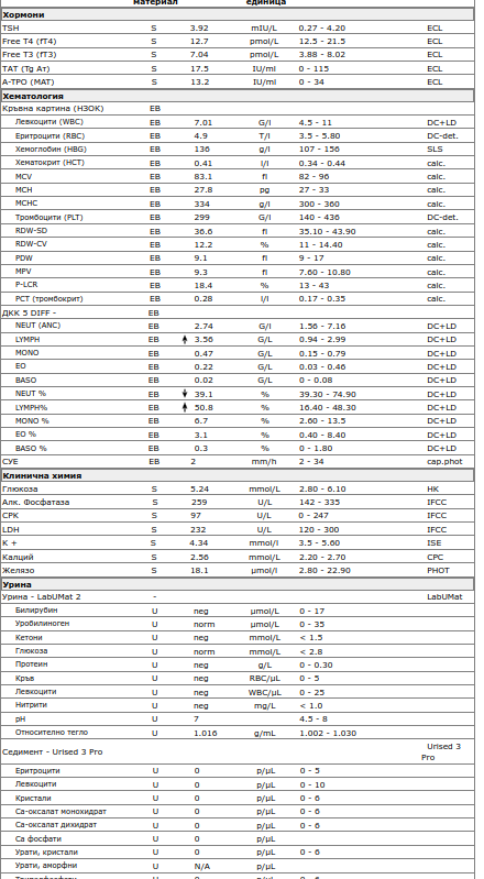Желязо    S          18.1        µmol/l      2.80 - 22.90      PHOT