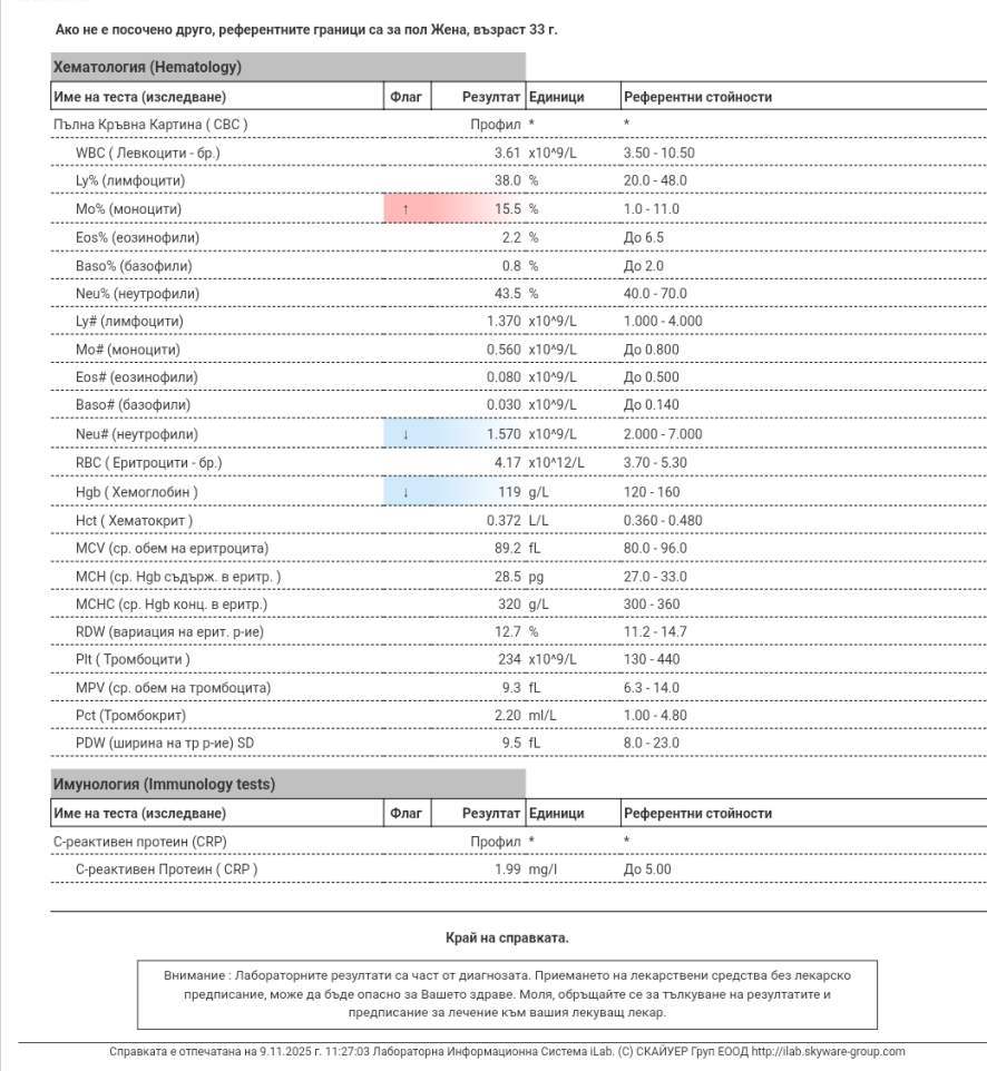 Здравейте ,имам нужда от разчитане на резултатите.Притесняват ме завишените нива на  еритроцитите  и ниските на тромбоцитите.Освен това имам възел на щитовидната жлеза,но не приемам хормони.На 44год.съм.
