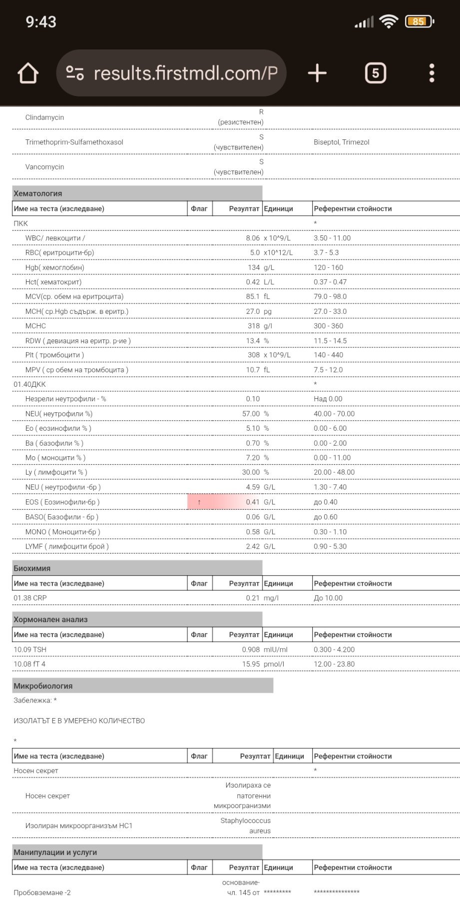 Здравейте искам да попитам хормоните на щитовидната жлеза е норма ли са тъй като за първи път ги изследвам и незнам,също и дали бактерията в носа изисква лечение ?